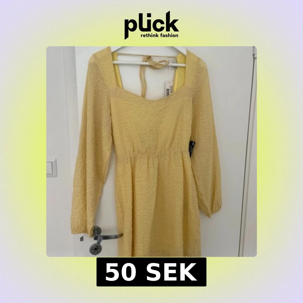 Säljer en söt ljusgul klänning från Nelly med långa ärmar och knytband i ryggen. Klänningen har en fin struktur och en smickrande passform. Perfekt för vår och sommar!