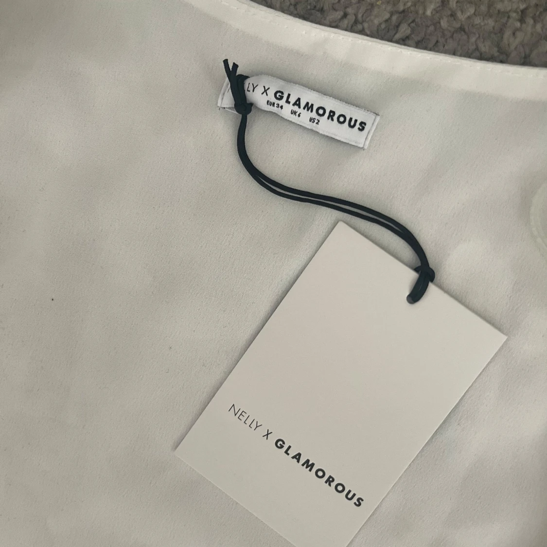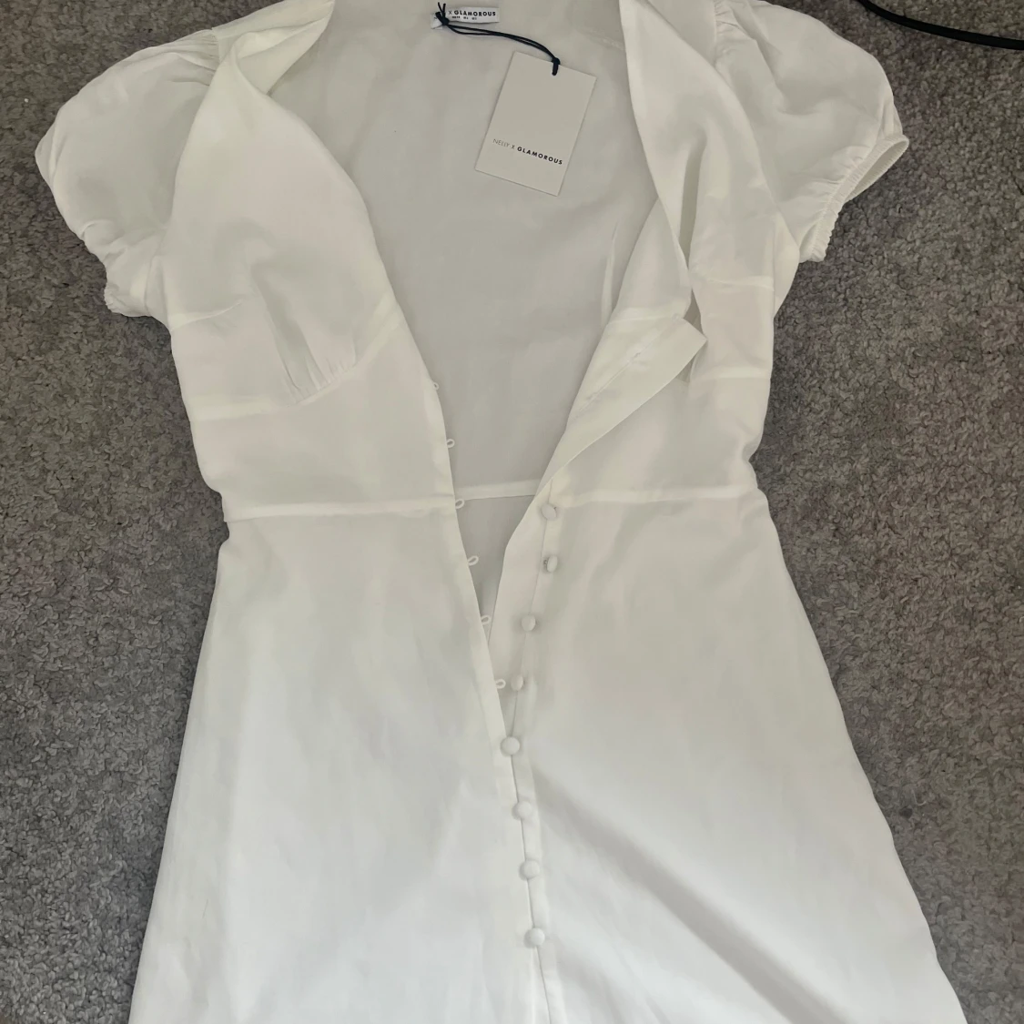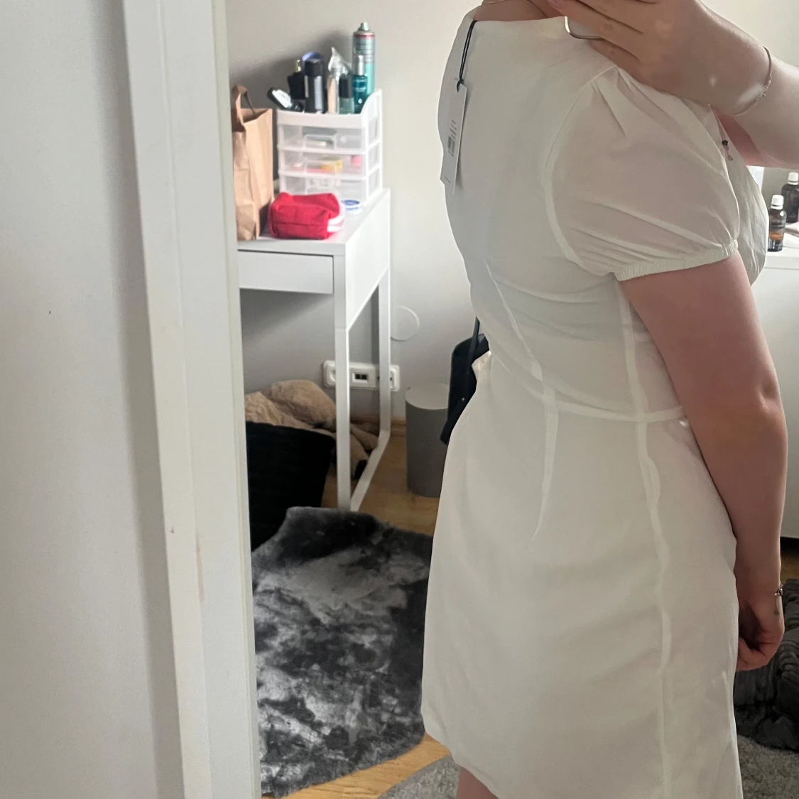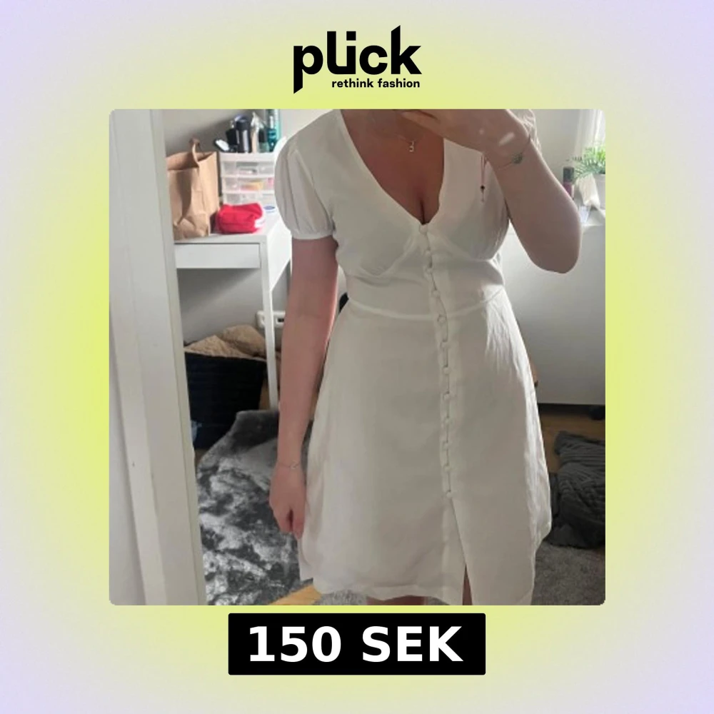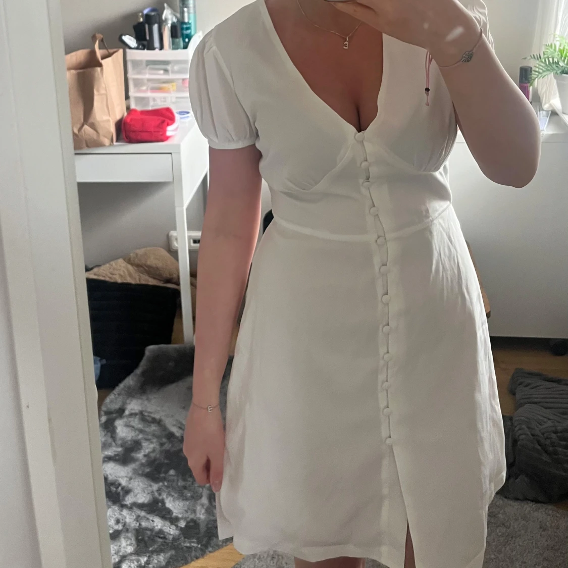 Supersöt vit klänning från Nelly med korta puffärmar och v-ringning. Klänningen har dekorativa knappar framtill och en figurnära passform som markerar midjan. Perfekt för sommarens alla tillfällen! Aldrig använd. Hör av er vid fler frågor eller bilder!💛