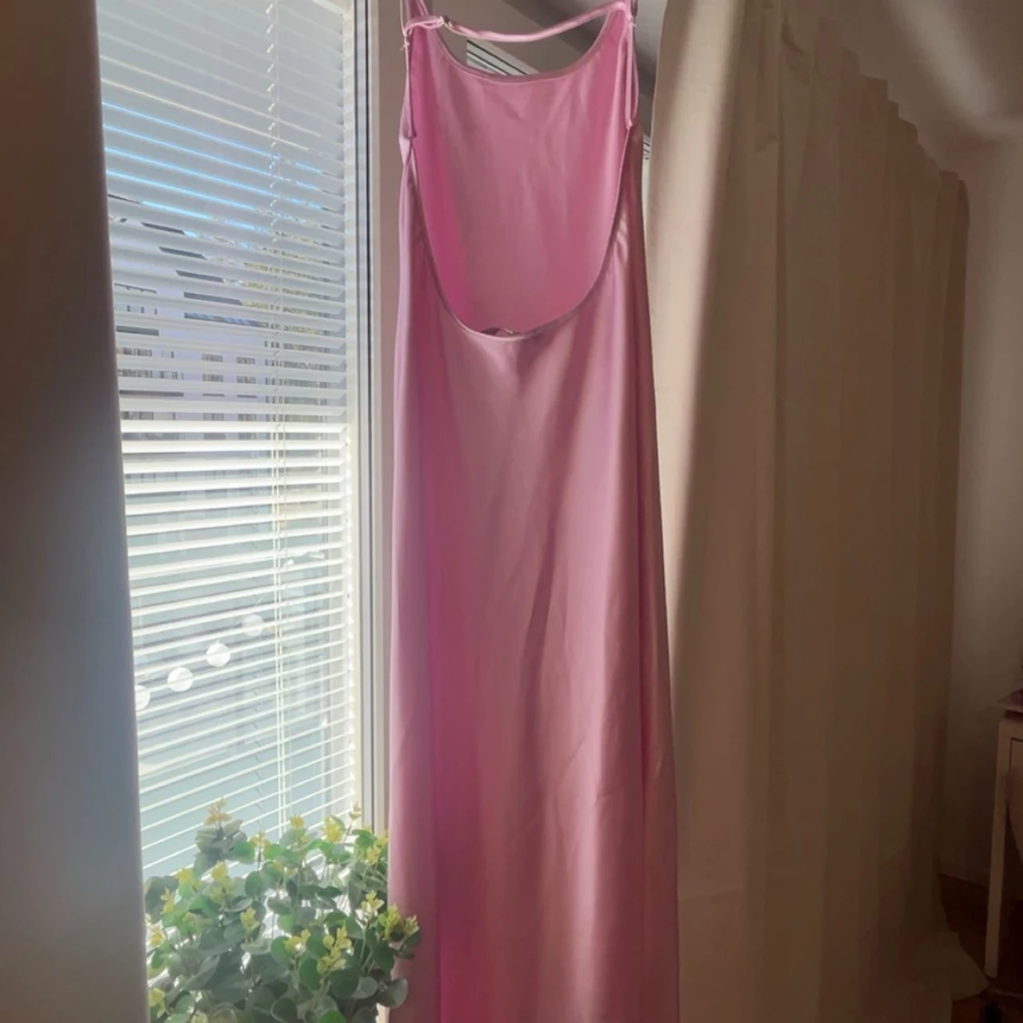 Säljer en elegant rosa långklänning med smala axelband. Klänningen har en enkel och stilren design, perfekt för somriga tillfällen. Materialet ser ut att vara lätt och luftigt, vilket gör den bekväm att bära.