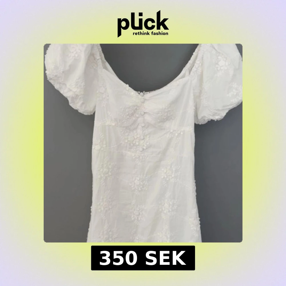 Supersöt vit kortklänning från Nelly med broderade blommor och puffärmar. Klänningen har dragkedja i ryggen och volangkant nertill. I storlek 36!