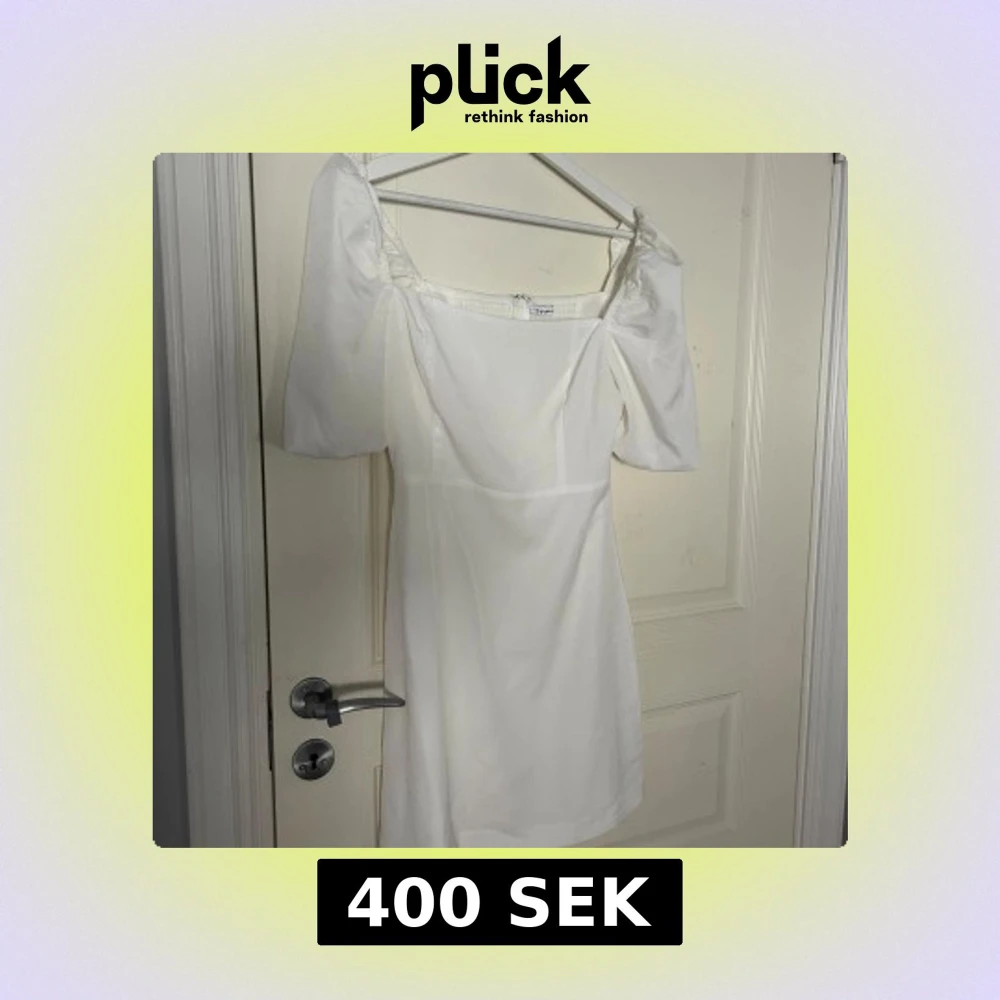 Säljer en stilren vit klänning med puffiga kortärmar och en elegant passform. Perfekt för sommarens alla tillfällen. Klänningen har en fyrkantig urringning och är gjord i ett lätt material. Använd 1 gång!