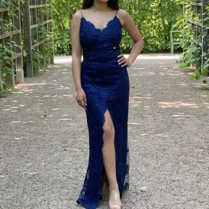 Marinblå spetsig klänning från Nelly, väldigt fin i skick använd bara en gång. Den är i storlek XS men passar För Small också