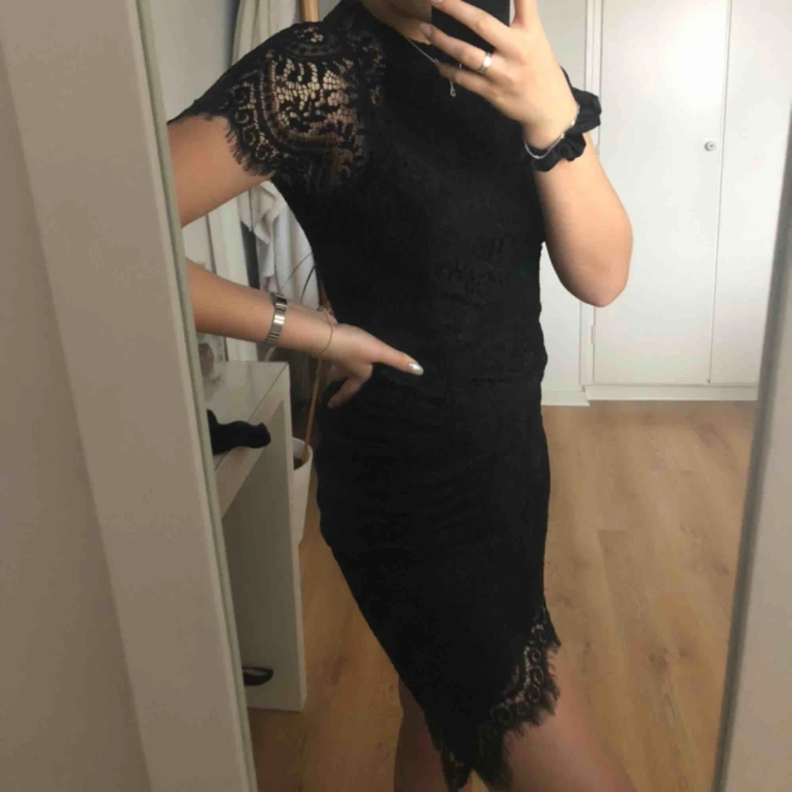 Svart spetsig klänning från Nelly, bra inför bal, tillställningar och m.m! Väldigt figursydd i ryggen men lösare framtill! Även fina spets detaljer som ger en extra knuff;) !