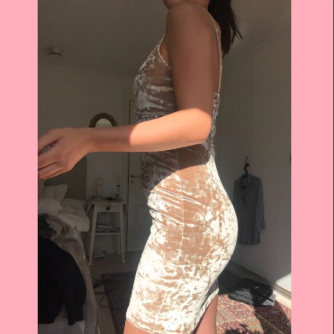 Oanvänd festklänning i sammet från Nelly, skiftar lite i färg men beige/rosa💗 sitter bra på mig som vanligtvis har storlek S.
