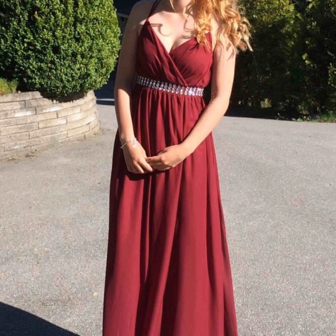 Säljer min gamla balklänning den är använd en kväll. Den är mörkröd i storlek S men XS passar den även. Den har ett pärlband i midjan med massa pärlor som sitter på framsidan. Ryggen är öppen med ett enkelt kryss av banden.