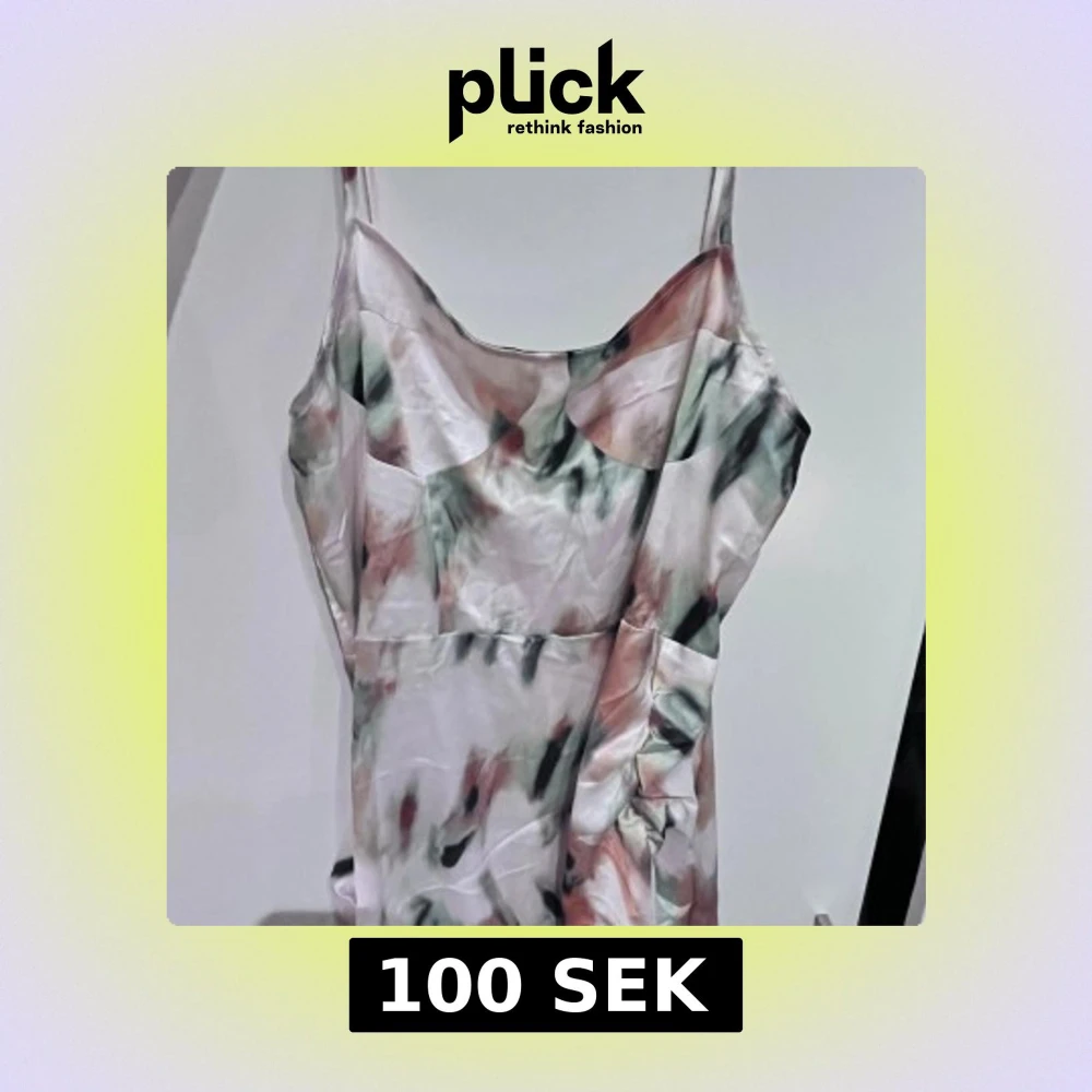 Säljer en lång, ärmlös klänning i siden med tunna axelband och abstrakt mönster i vitt, grönt, svart och persikorosa. Klänningen har en slits framtill och en mjuk, glansig finish som ger en lyxig känsla. Perfekt för dig som gillar unika plagg med coola färgkombinationer.