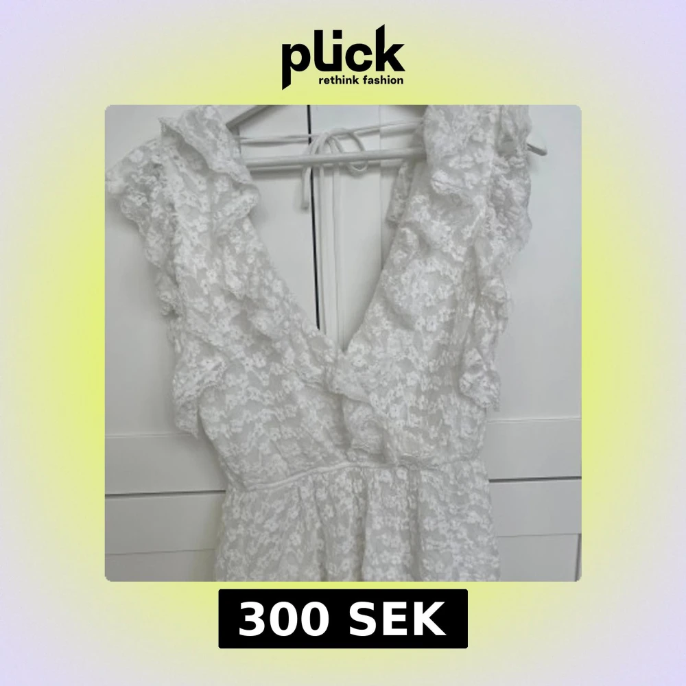 Superfin vit spetsklänning från Nelly med volangdetaljer och v-ringning. Klänningen har omlottkänsla upptill, knytband i nacken och är ärmlös. Perfekt för sommarens alla tillfällen när du vill känna dig extra söt.