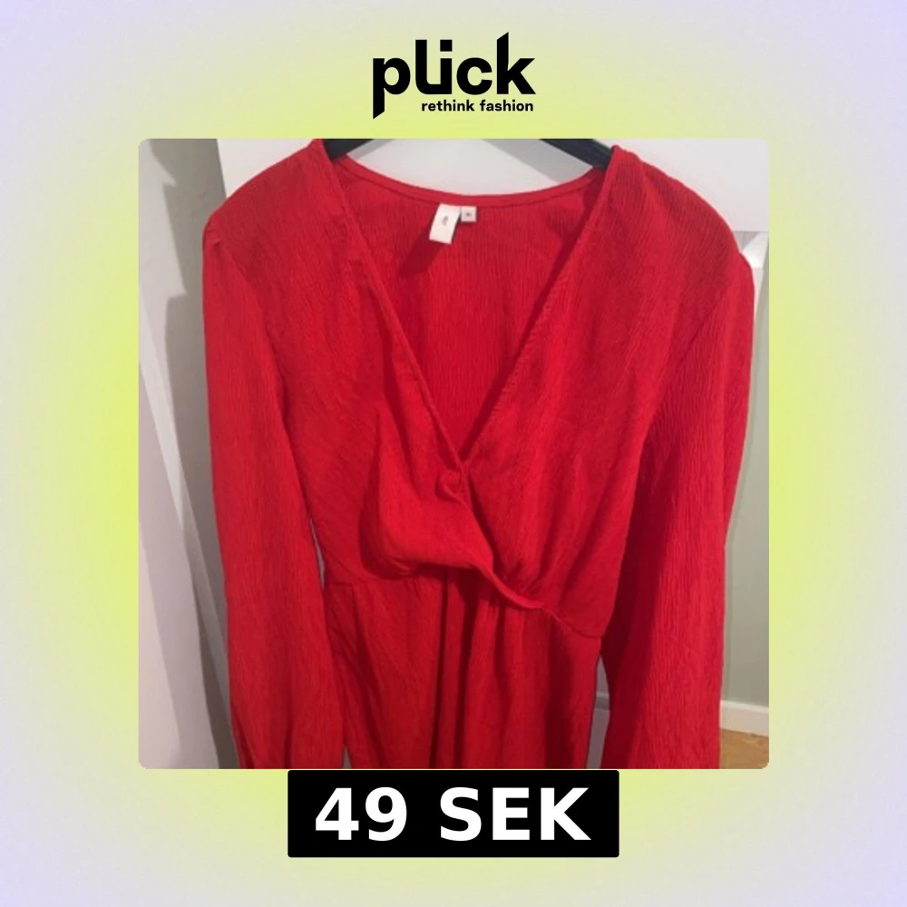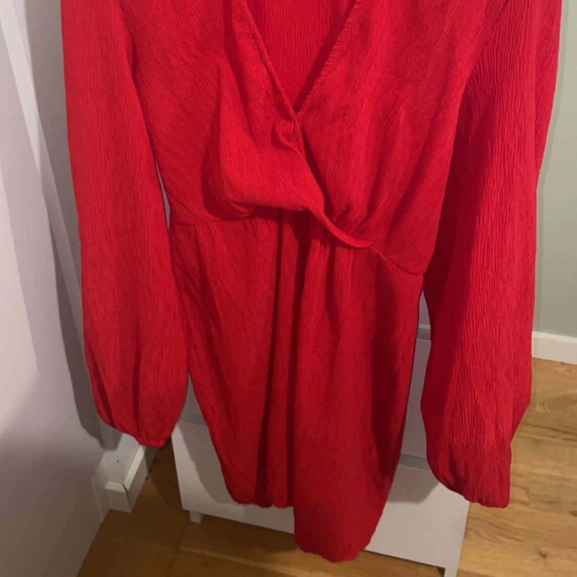 Röd kort omlottklänning med lång ärm och v-ringad hals. Klänningen har en lätt rynkad struktur i tyget och markerad midja. Perfekt för dig som vill sticka ut med en färgstark look.