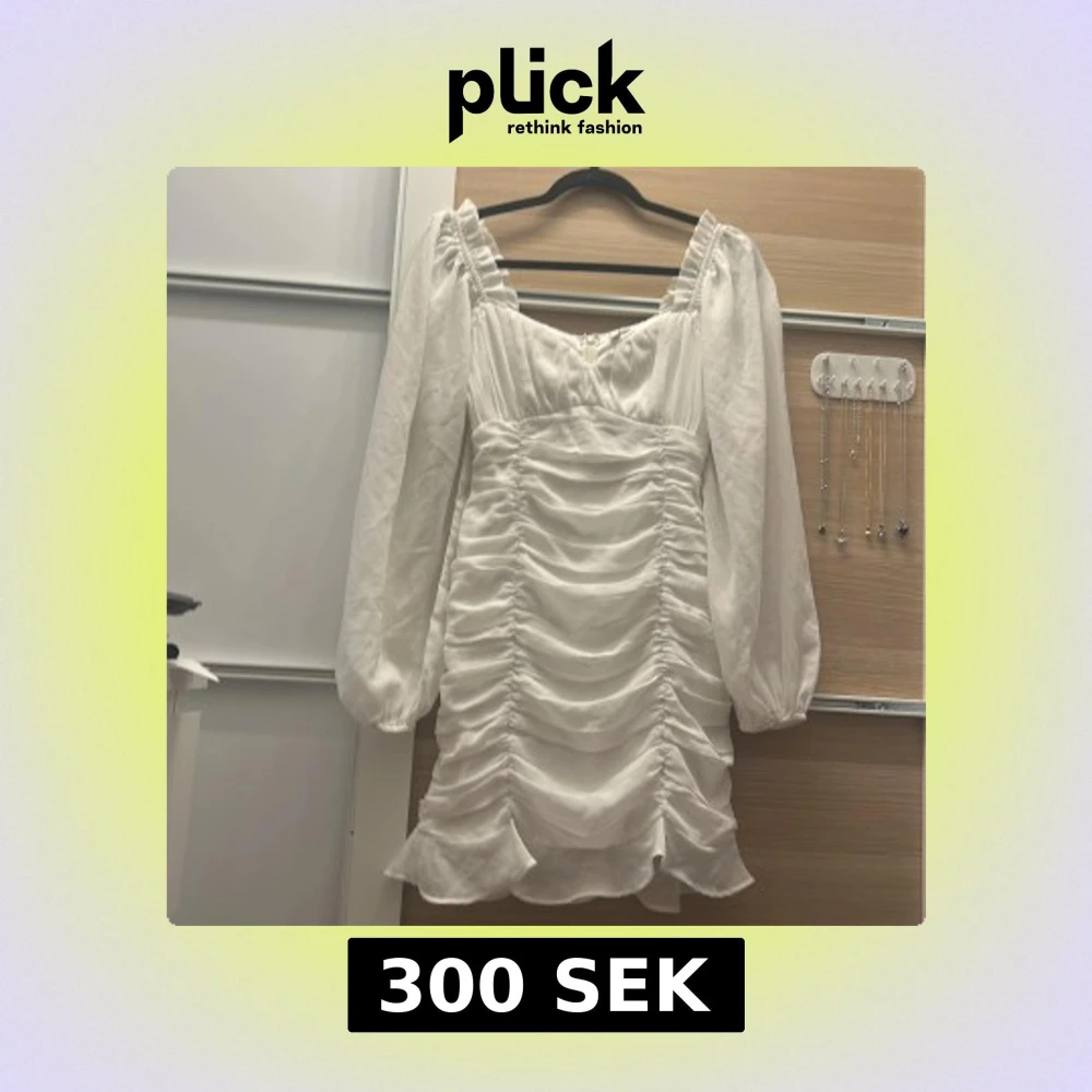 Säljer en elegant vit klänning från NLY Trend med långa ärmar och rynkade detaljer. Klänningen har en dragkedja i ryggen och en volangkant nedtill. Perfekt för en stilren look.