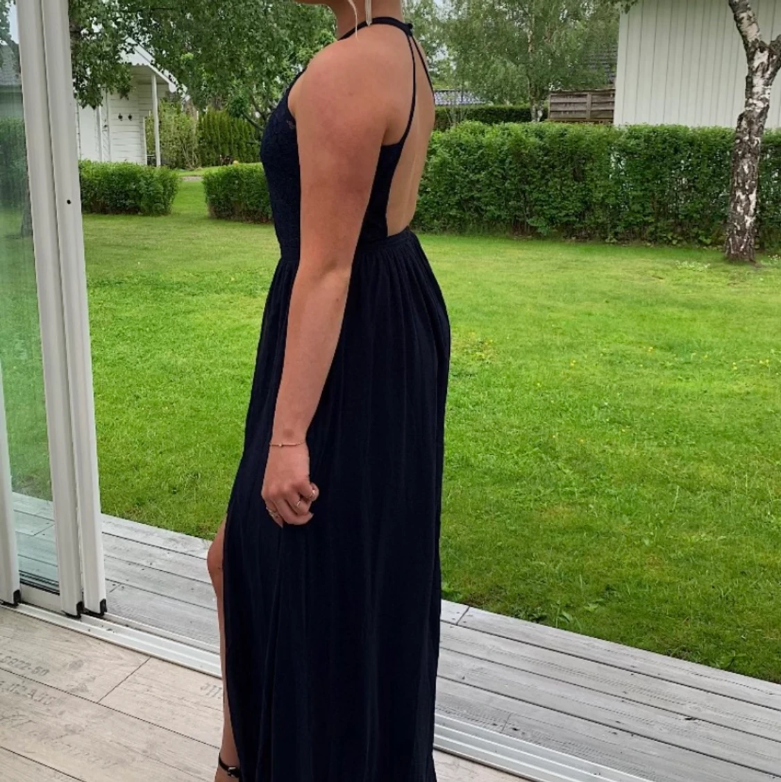 Fin marinblå klänning! Öppen rygg, en slits, spets upptill. Använd en gång, storlek 34 men skulle säga att den mer är som en 36! Från Nelly