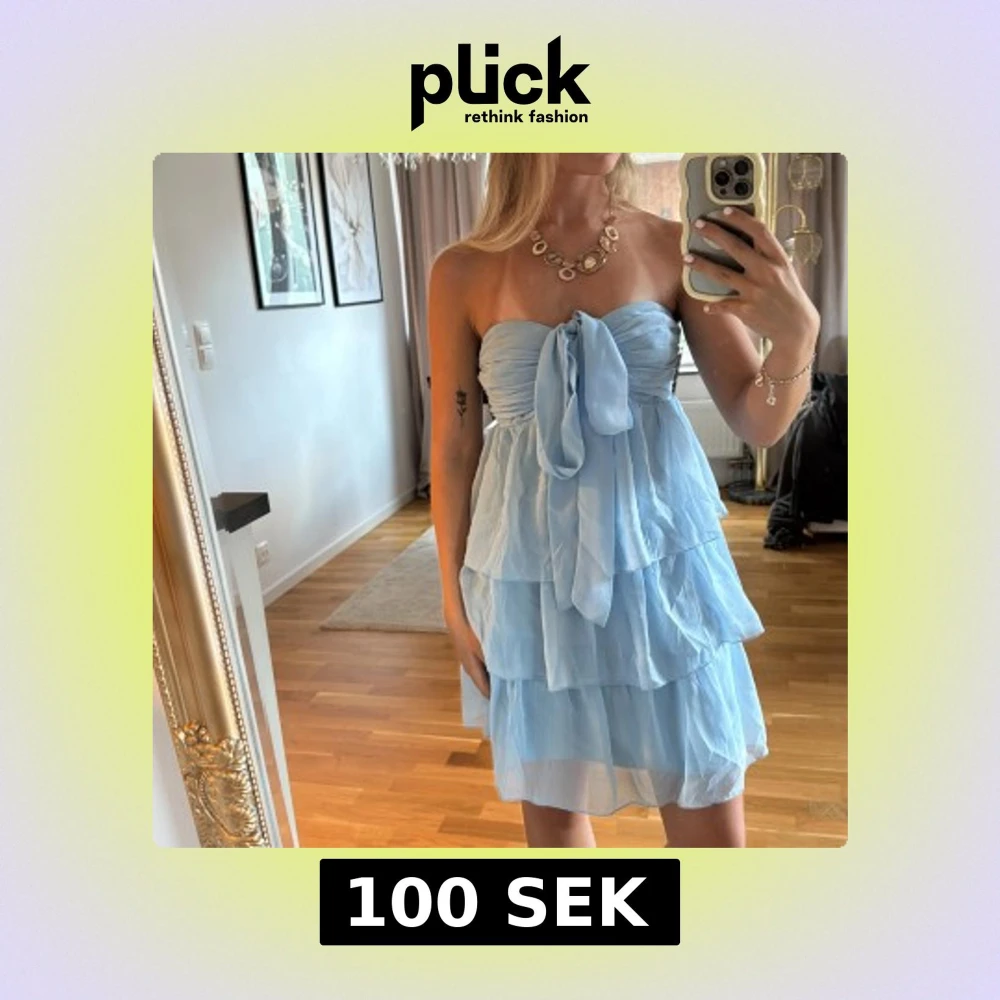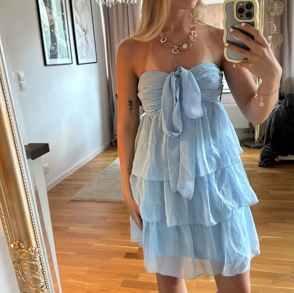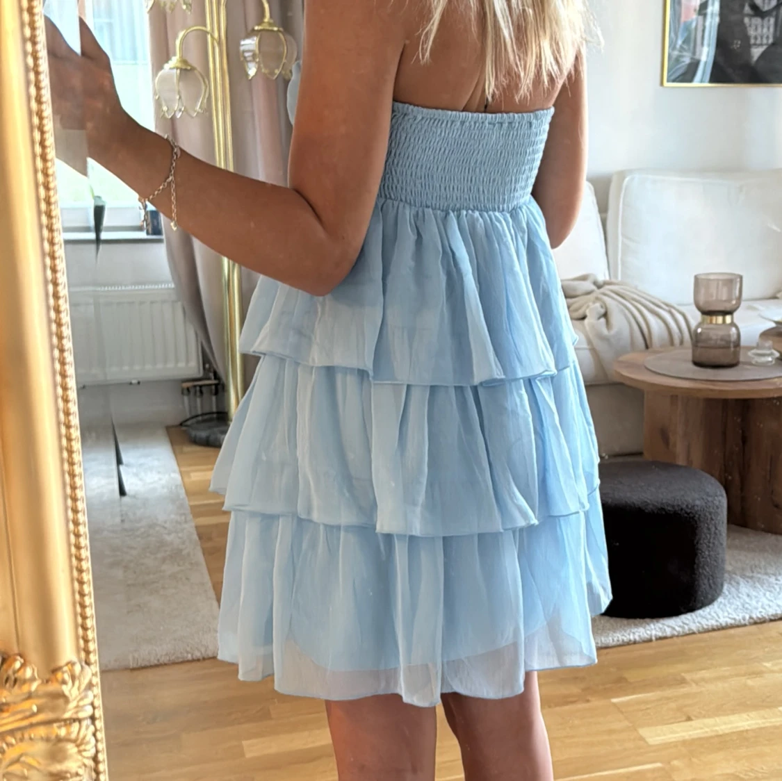 Superfin ljusblå klänning från Nelly med flera lager volanger och axelbandslös design. Framtill har den en stor knytrosett och smock i ryggen för skön passform. Perfekt för sommarens alla tillfällen, lätt och luftig i materialet.🩵🩵