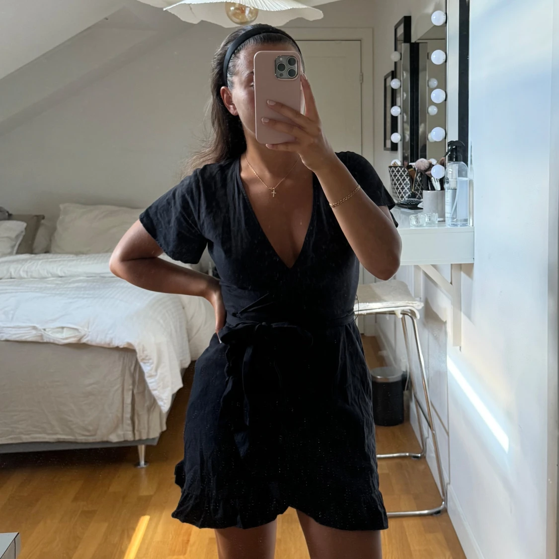 Sååå fin svart kort klänning med omlott och volang. Kommer inte till användning längre men den är så fin och endast använt 2 gånger 🖤.
