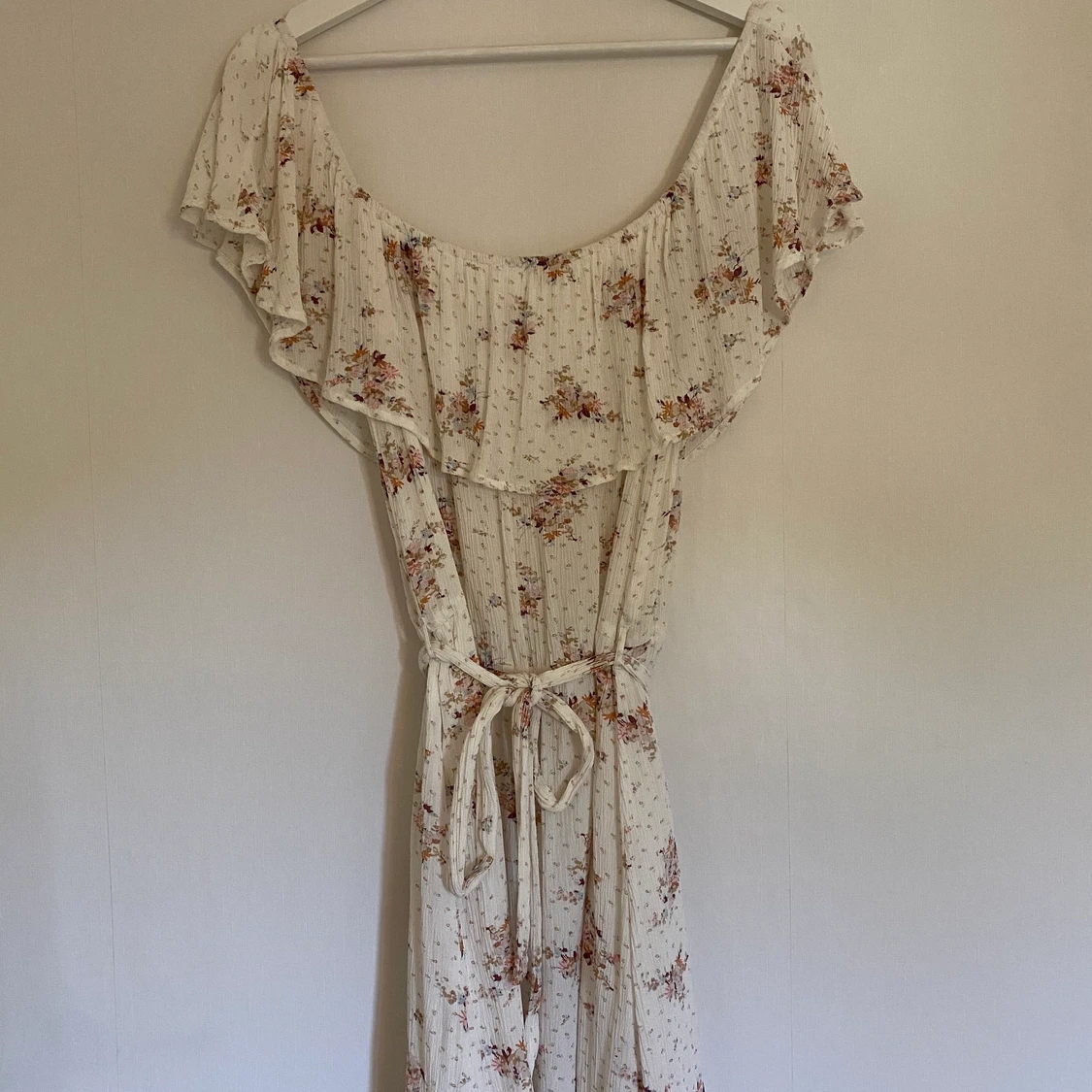 En blommig off shoulder klänning från Nelly. Endast använd en gång. Köparen står för frakt.