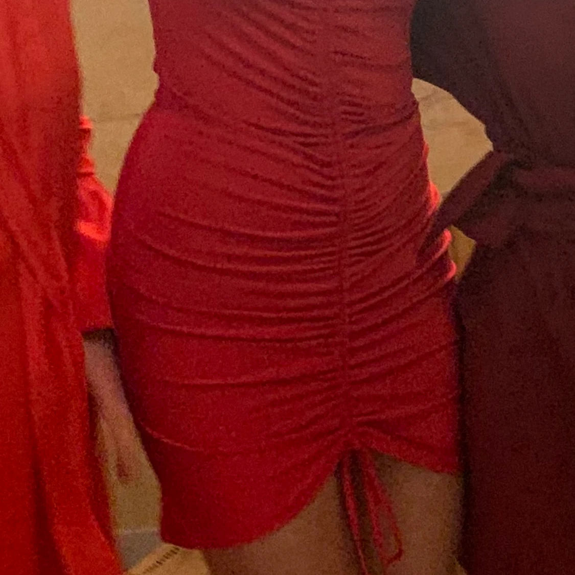 Säljer denna supersköna och snygga klänningen från Nelly! Den är i storlek S men är väldigt stretchig. Jag brukar ha M och såhär sitter den på mig. Längden går att skjustera med snörningen som går längs mitten på klänningen. Säljer pga vet inte när jag ska snvända den. Endast använd 1 gång!:) Köparen står för frakten