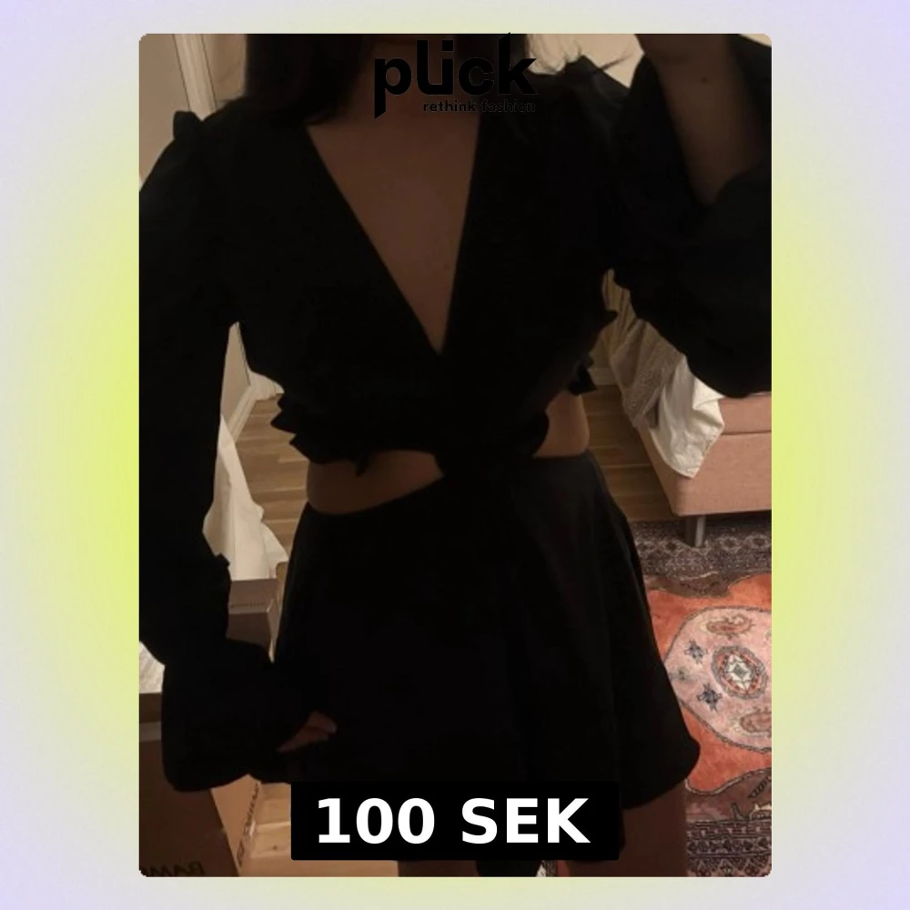 Säljer en svart klänning med långa, utsvängda ärmar och djup v-ringning. Klänning har en cut-out detalj i midjan och knyt framtill. Materialet känns lätt och flowy, perfekt för dig som vill ha något stilrent men ändå edgy.