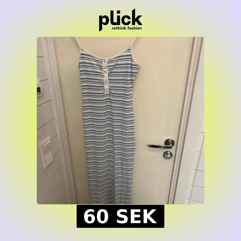 Säljer en somrig långklänning med blå och vita ränder. Klänningen har smala axelband och knappar framtill. Perfekt för varma dagar! Otroligt skön. Lite nipprig men inget man störs av.
