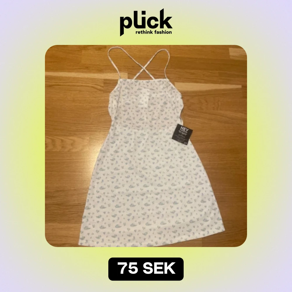 Supersöt miniklänning i vit med blåa blommor. Knyts förslagsvis som på bild 2 i ryggen. 🦋 Stretchigt material samt resår bak runt midjan. Lite genomskinlig.