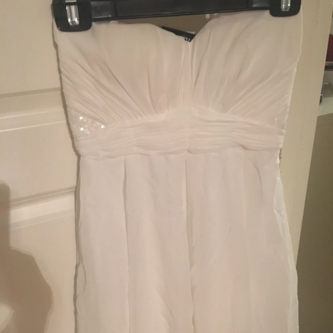 Säljer en vit klänning utan axelband storlek S från Nelly med dragkedja i sidan, aldrig använd & prislappen sitter kvar.