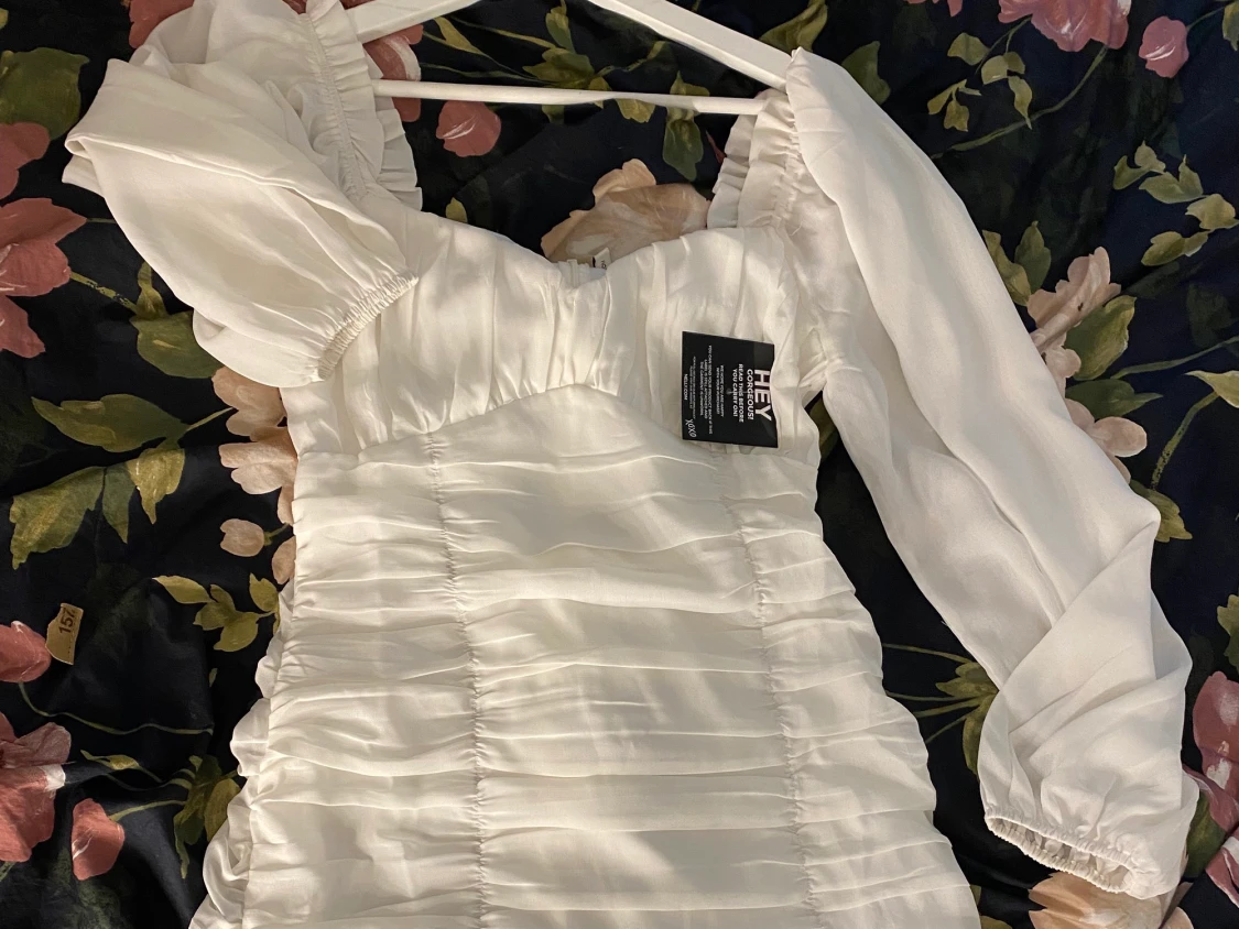 Vit klänning från Nelly.com helt oanvänd med LAPPRNA KVAR!🤍 Säljer då den blivit för stor för mig🤍