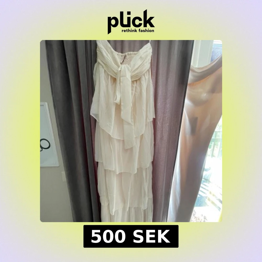 Säljer en ljus långklänning med flera lager volanger och stor rosett framtill, perfekt för sommarens tillfällen. Aldrig använd och prislappen finns kvar💞