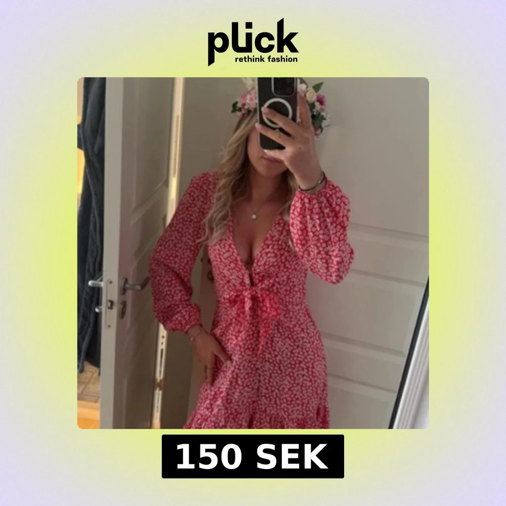 Supersöt rosa kortklänning med vita småblommor, djup v-ringning och knyt framtill i midjan. Klänningen har långa puffärmar med resår vid handlederna och volangkant nertill. Perfekt för sommarens alla tillfällen! Från Nelly, storlek xs.