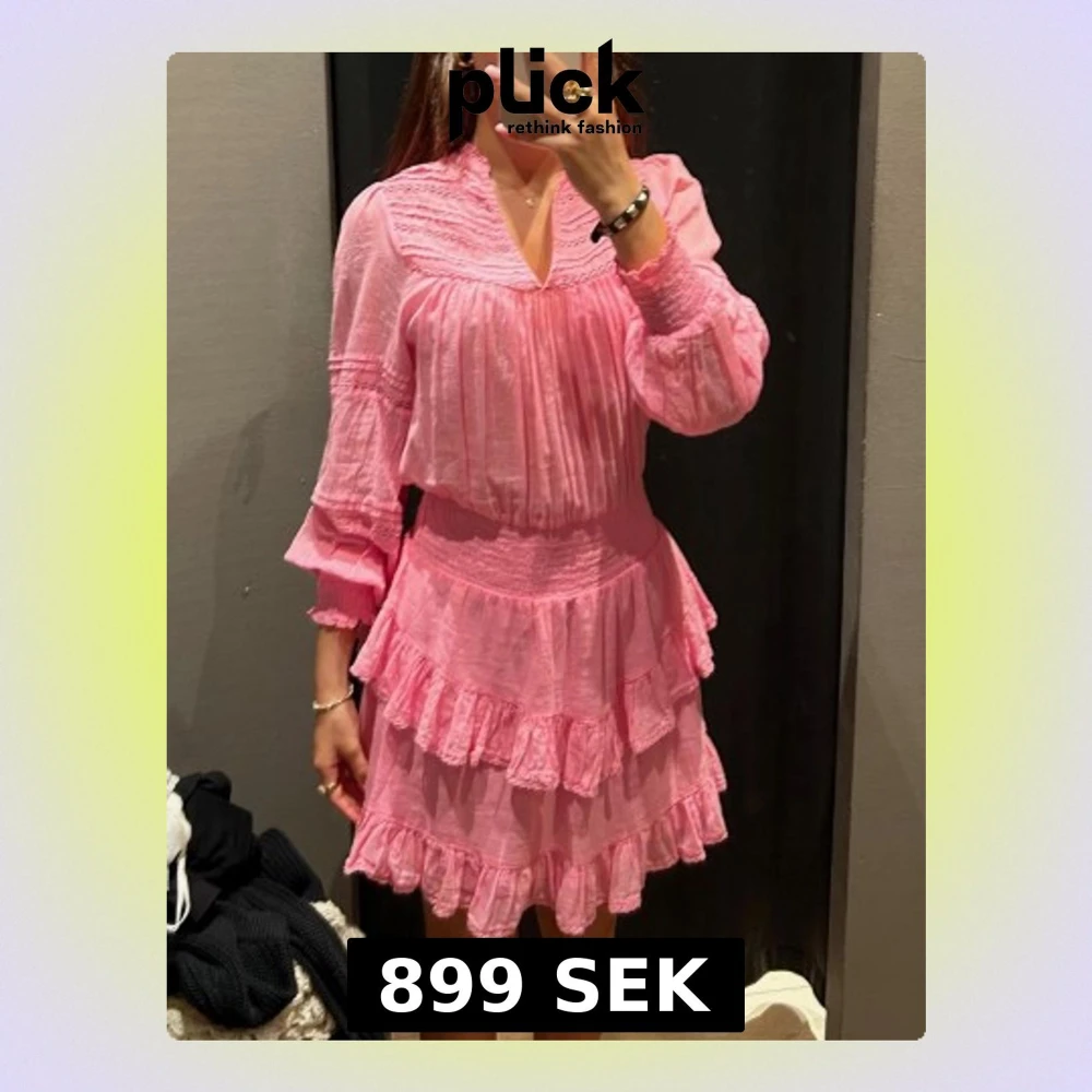Supersöt kort rosa klänning med v-ringad hals och långa ärmar. Klänningen har flera lager med volanger och smock i midjan för en snygg passform. Materialet känns lätt och luftigt, perfekt för varmare dagar. Slut såld svår att hitta.