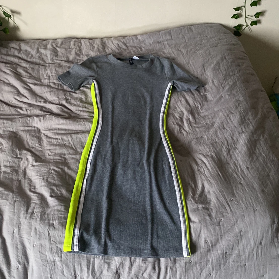 En tajt klänning ifrån Divided (H&M). Grå med vita och neon grön/gula ränder. Kontakta för mer info😊