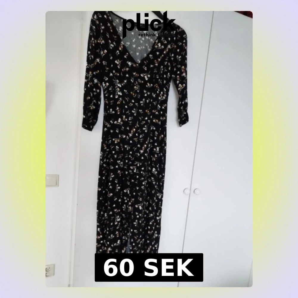 Supersnygg svart långklänning från NA-KD med små blommor i vitt och beige. Klänningen har v-ringad hals, trekvartsärm och ett lätt, flowigt tyg som ger en skön känsla. Perfekt för dig som gillar romantiska detaljer och vill ha en klänning med lite extra längd
