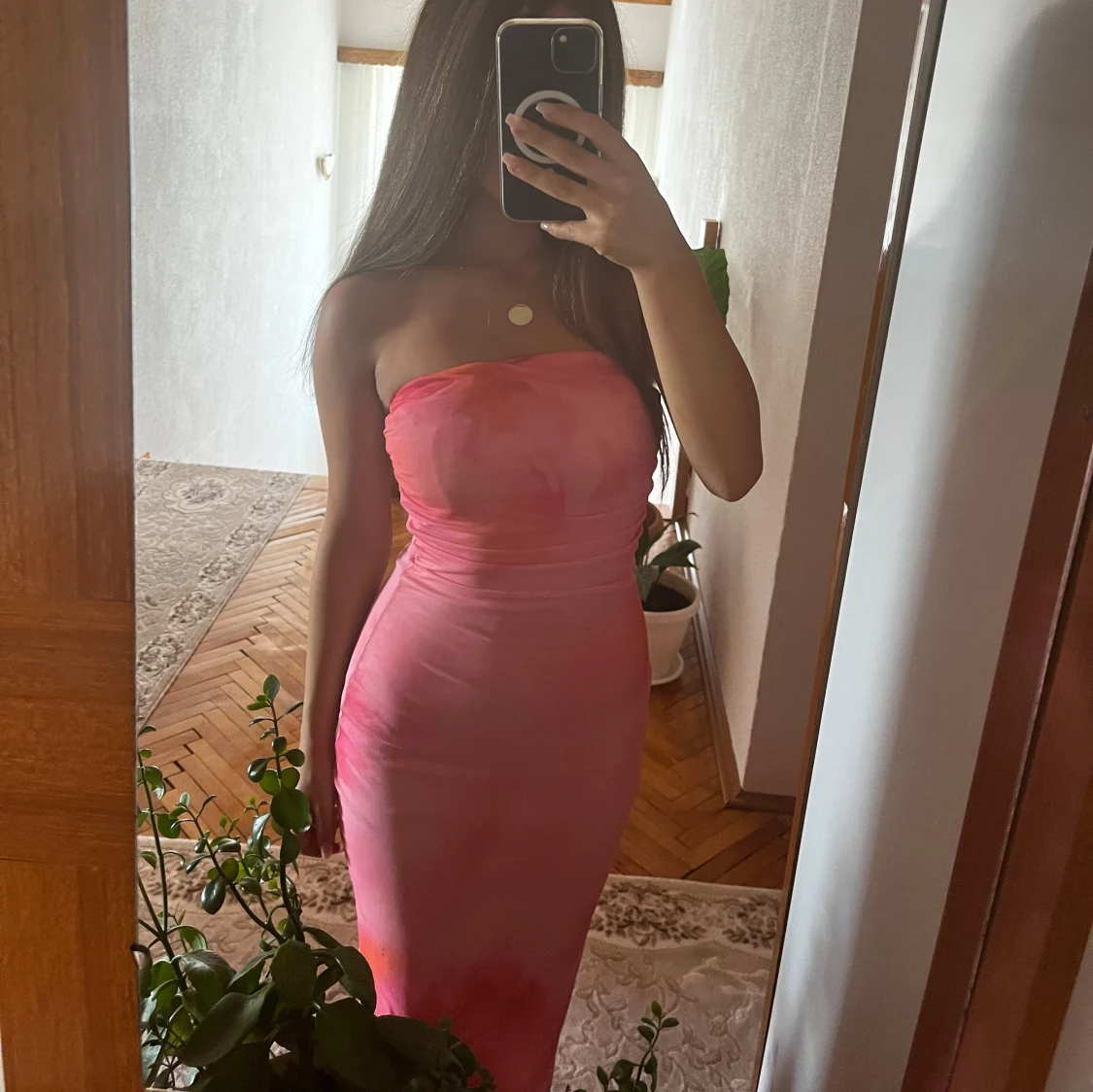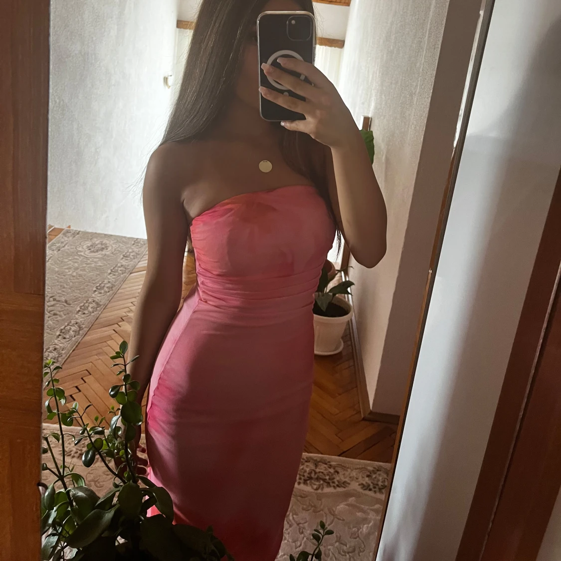 Säljer en snygg axelbandslös långklänning i olika rosa nyanser. Klänningen har en tight passform och är figurnära med en mjuk, slät yta. Perfekt för dig som vill sticka ut med en feminin och trendig look.