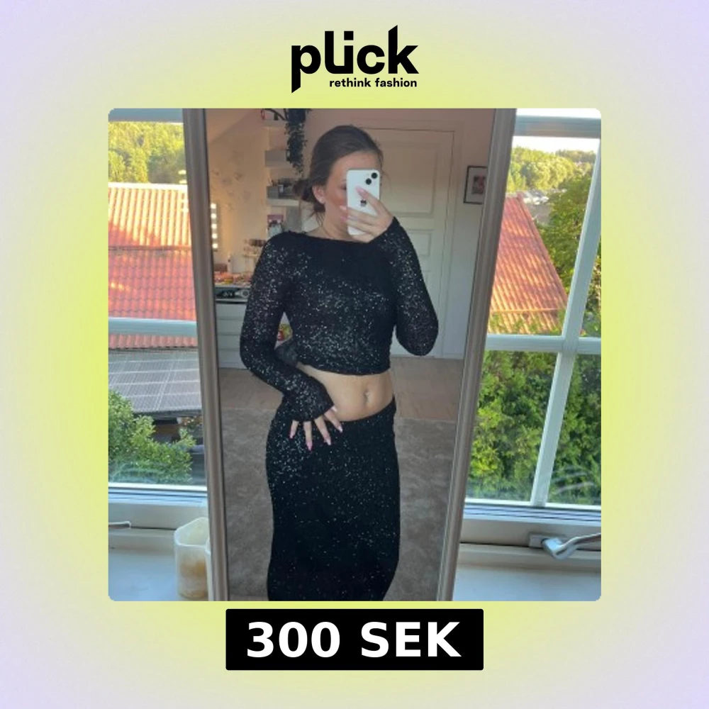 Säljer ett svart sätt med tröja och kjol med glittriga paljetter över hela tyget. Perfekt för dig som vill sticka ut med en glam look.