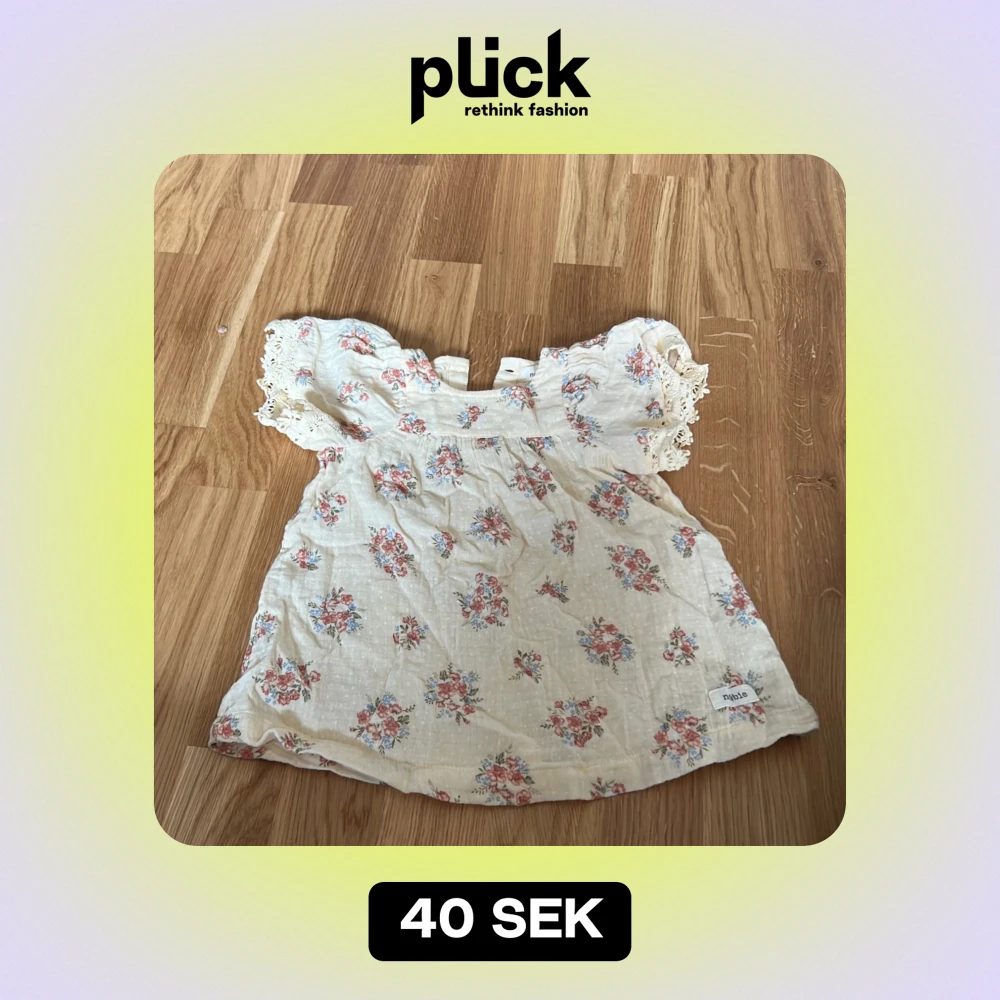 Söt blommig klänning från Newbie i storlek 68 för 4-6 månader. Klänningen har korta ärmar med spetsdetaljer och ett vackert blommönster i rosa och blått på en beige bakgrund. Perfekt för sommarens varma dagar.