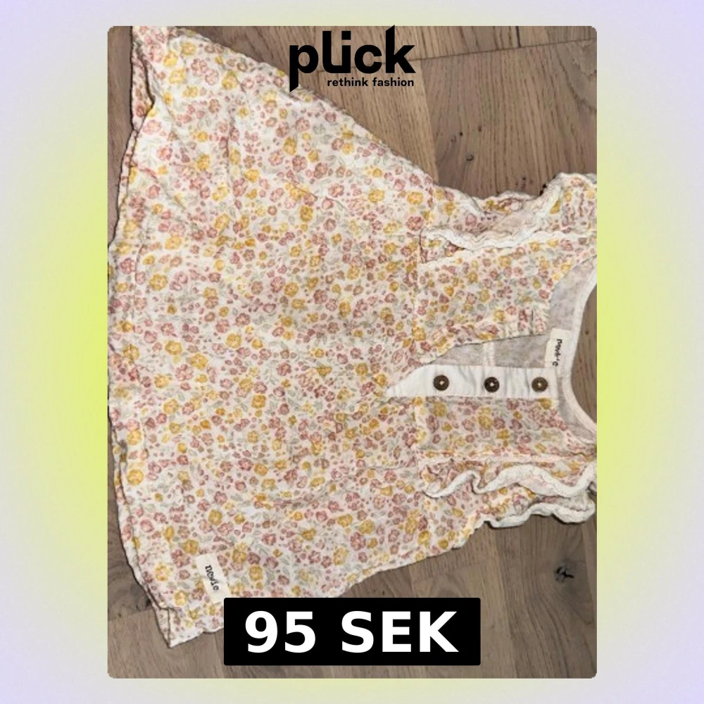 Supersöt kortklänning från Newbie i storlek 74. Klänningen är vit med små blommor i rosa och gult, har volangdetaljer vid axlarna och knappar framtill. Perfekt för vår och sommar, tillverkad i mjuk bomull. Söt klänning med blommigt mönster och volangdetaljer. Klänningen har knappar framtill.
