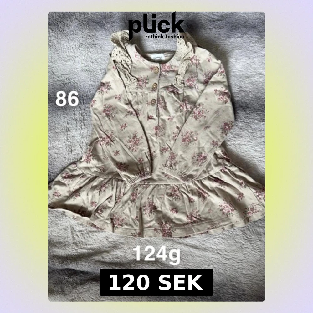 Söt beige klänning från Newbie med rosa blommönster, spetsdetaljer vid axlarna och knappar framtill. Klänningen har lång ärm och volang nedtill, perfekt för vår och sommar. 🌸Fint använt skick. Storlek 86
