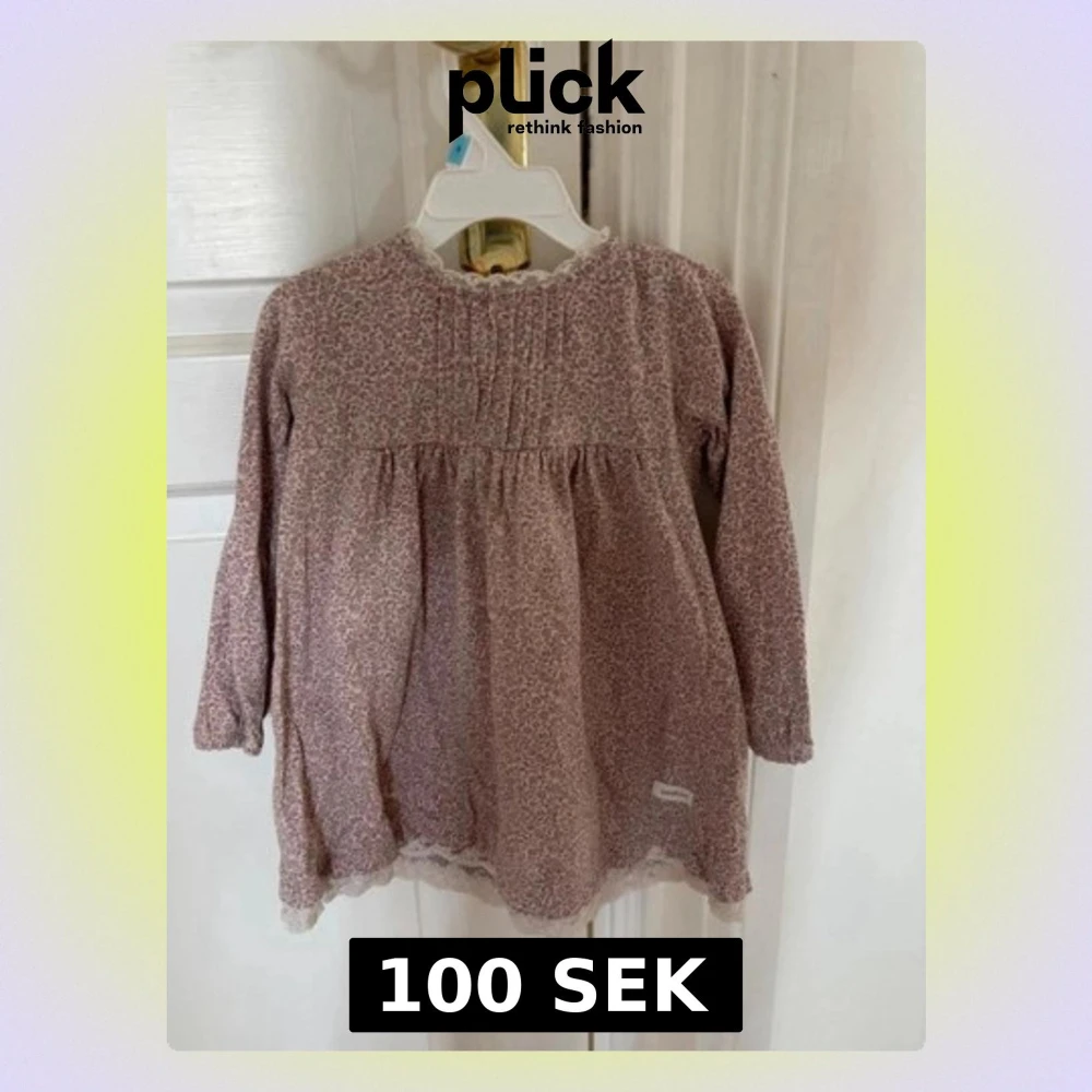 Söt ljusrosa klänning med småblommigt mönster och lång ärm. Klänningen har rundad hals, rynkdetaljer upptill och spetskant längst ner. Perfekt för dig som gillar romantisk och feminin stil. Från newbie storlek 98.