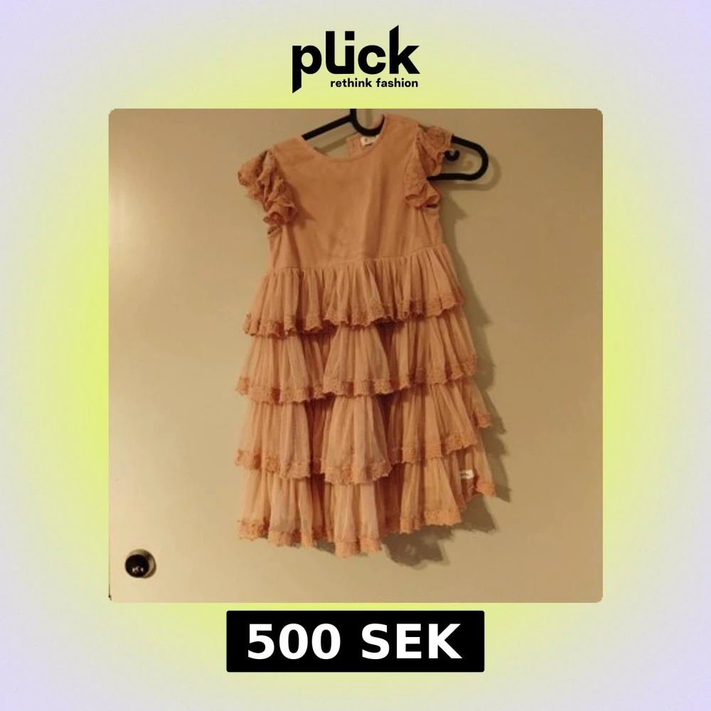 Supersöt rosa klänning med flera lager volanger och spetsdetaljer på både ärmar och kjol. Klänningen har korta volangärmar och en rund halsringning. Perfekt för dig som vill sticka u med en romantisk och lekfull stil newbie klänning storlek 122