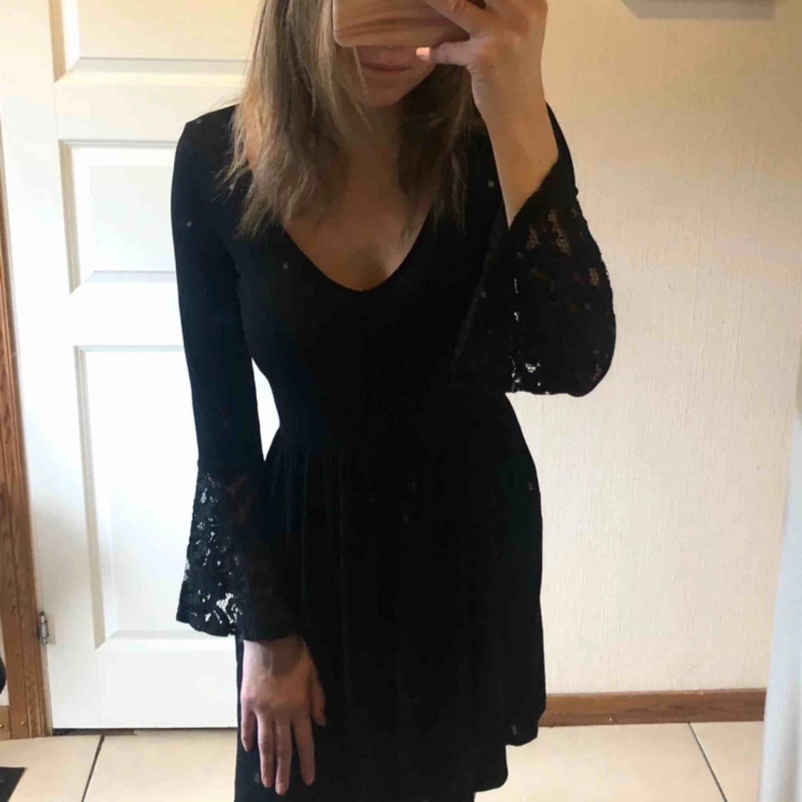 Säljer denna jättefina svarta klänningen som tyvärr inte kommer till användning av mig. Den är bara använd 3 gånger. Superfin med trumpetarmar i spets och öppning på ryggen 🌸 Slutar vid mitten på låten och är i mjuk tyg. ❣️