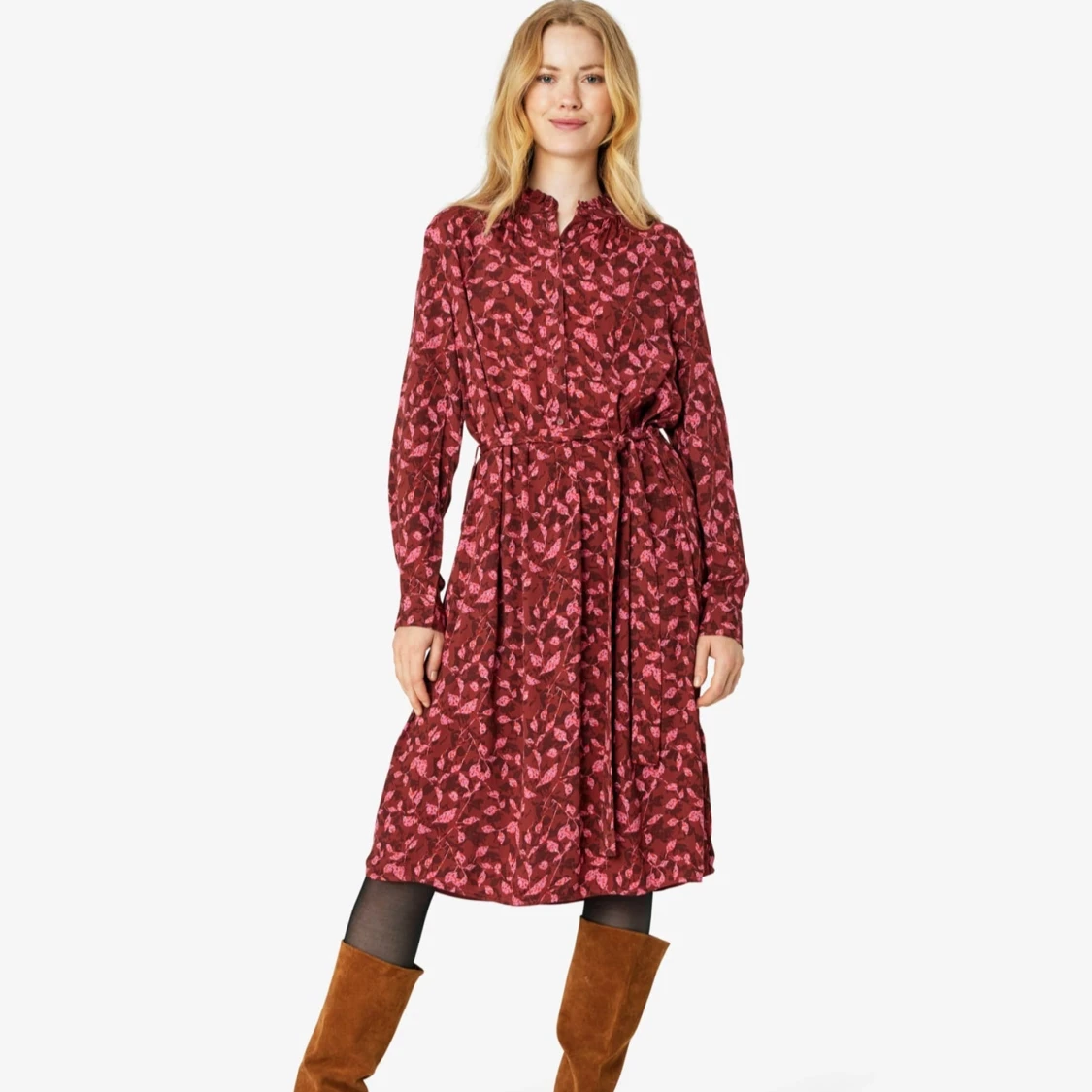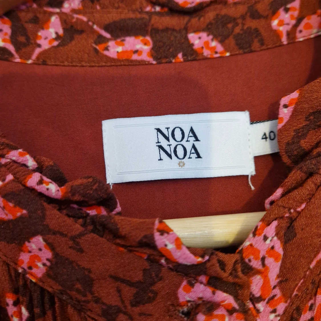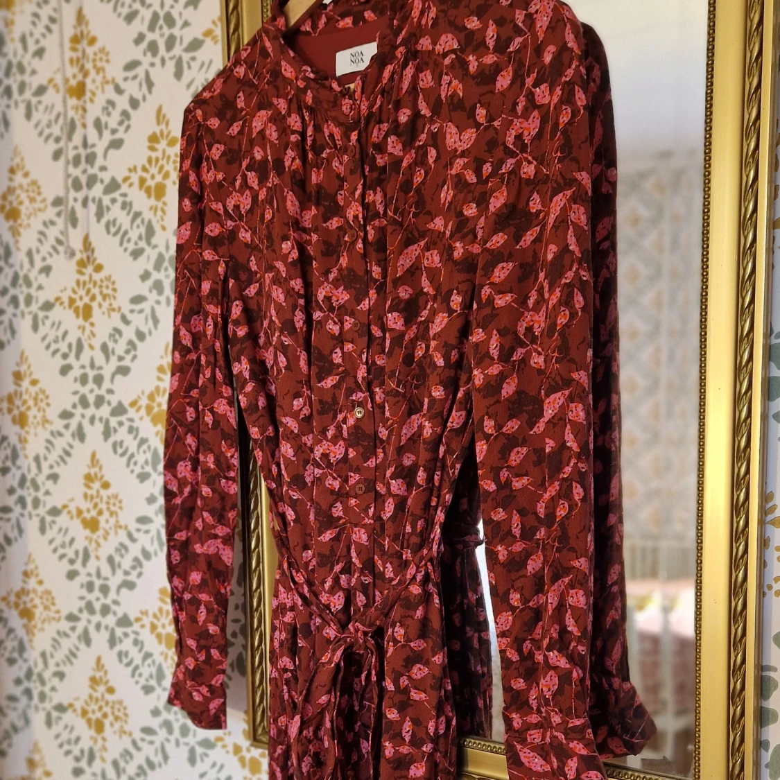 Säljer en superfin blommig klänning från Noa Noa i vinrött med rosa och röda blommor. Klänningen har lång ärm, knytband i midjan och skjortkrage. Den är tillverkad i mjuk viskoskvalitet och har en avslappnad passform som ger en snygg siluett. Inga anmärkningar.