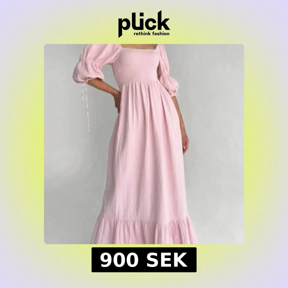 Charmig ljusrosa långklänning med puffiga trekvartsärmar och smockdetaljer upptill. Från det populära märket NOMINO🥰Klänningen har en luftig passform och en volangdetalj vid fållen, perfekt för somriga dagar men även för kallare dagar då den har ett tjockare tyg😍Nypris 1500! Använd en gång.
