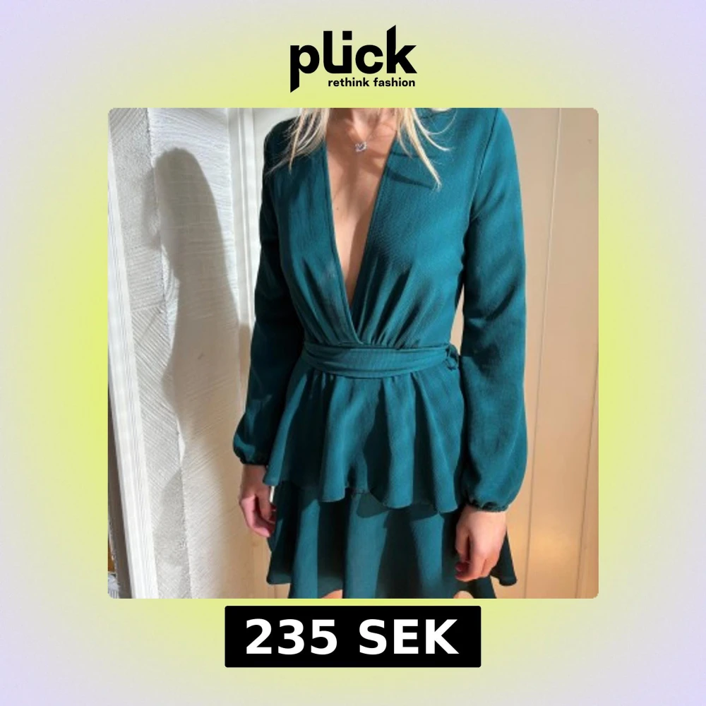 Supersnygg mörkgrön kortklänning med djup v-ringning, långa ärmar och omlottliv. Klänningen har volangdetaljer i kjolen och ett knytband i midjan som ger en markerad siluett. Perfekt för dig som vill sticka ut med en elegant och trendig look. Ny med prislapp!!