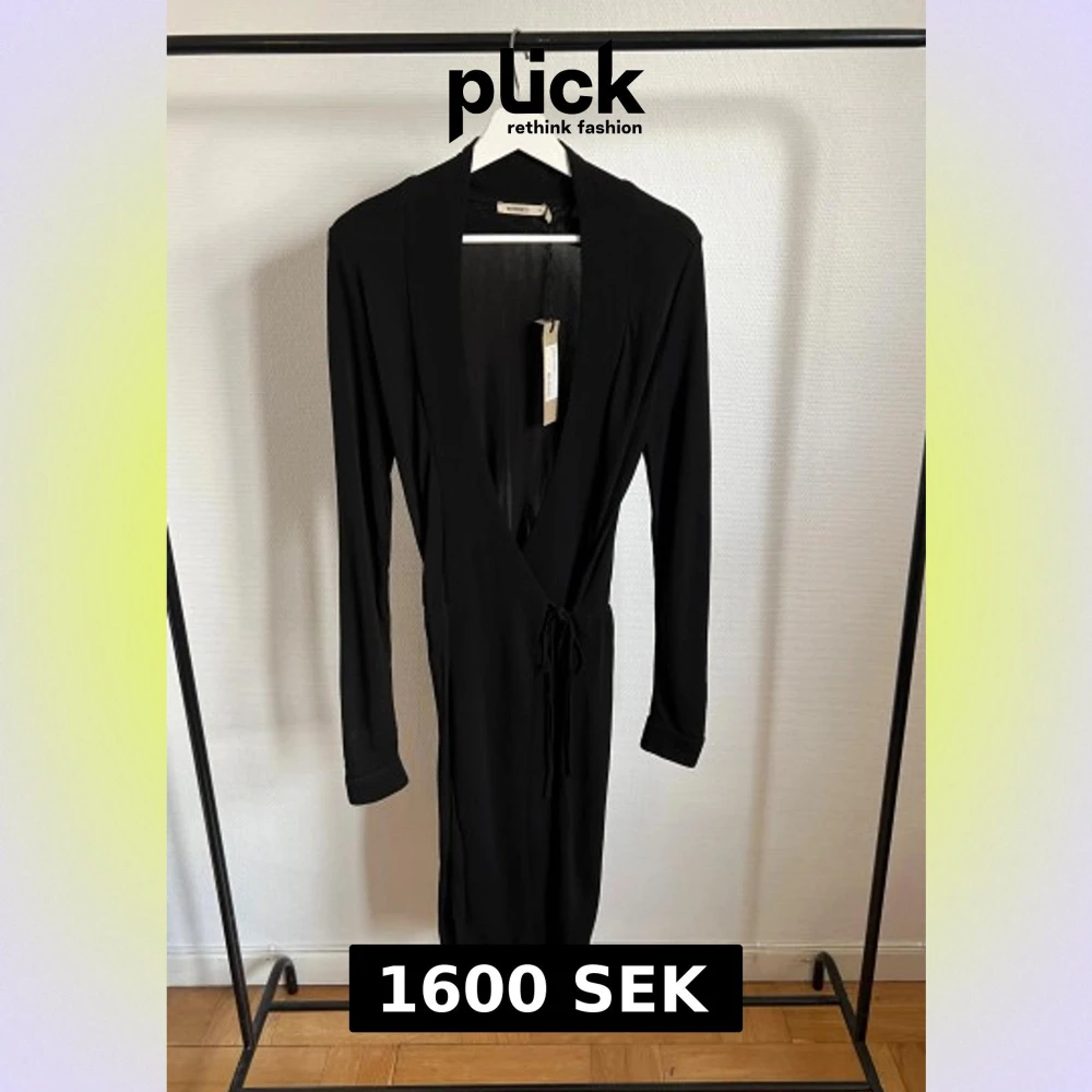 Aldrig använd, bara provad hemma. Prislappen är kvar! Svart långärmad omlottklänning från Whyred med djup v-ringning och knyt i midjan. Materialet känns lyxigt! Stängs med en knapp på insidan och banden som man knyter. Också fin att bara ha helt öppen. Står att det är storlek S men passar mig som är M.