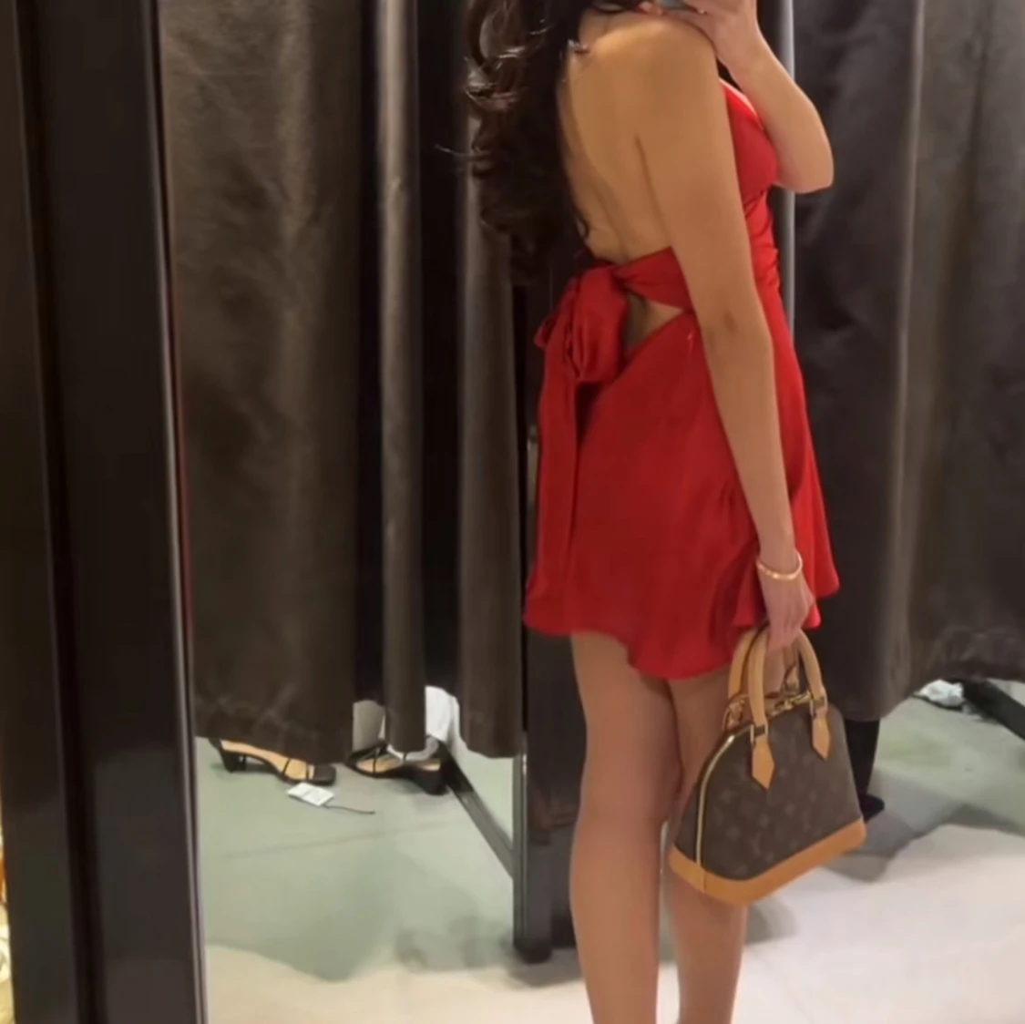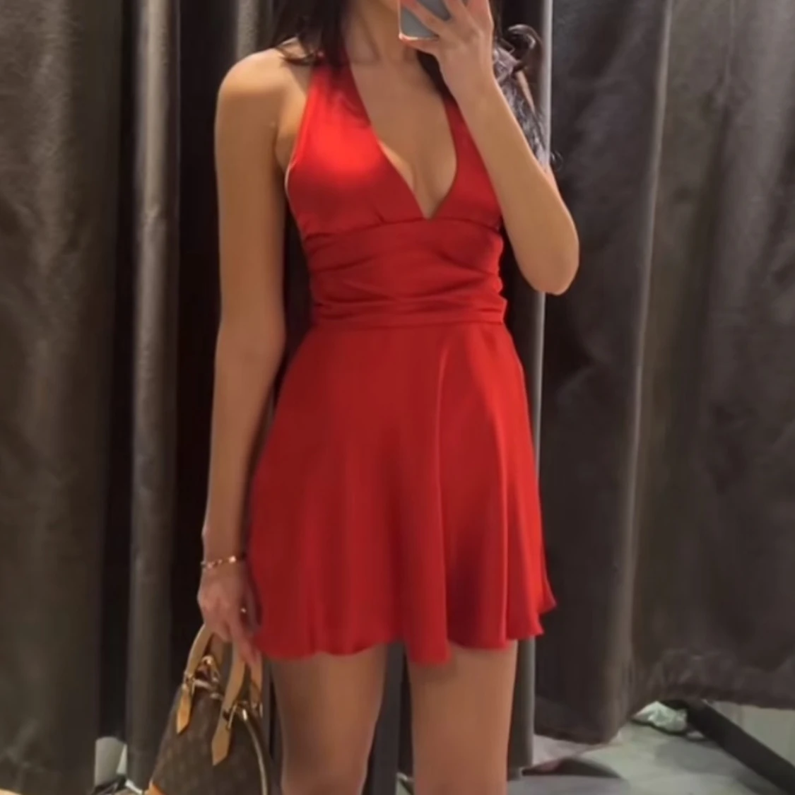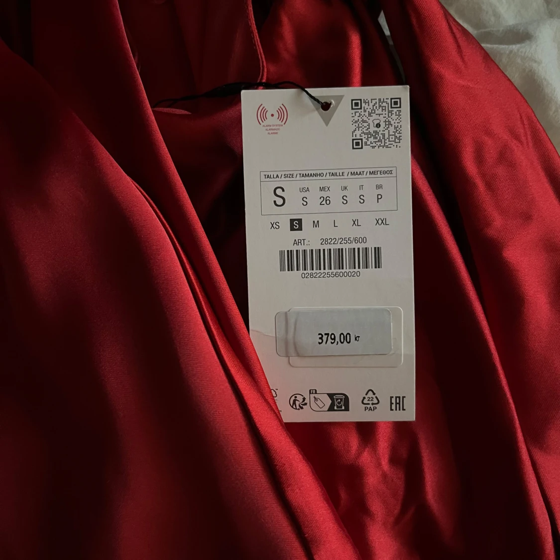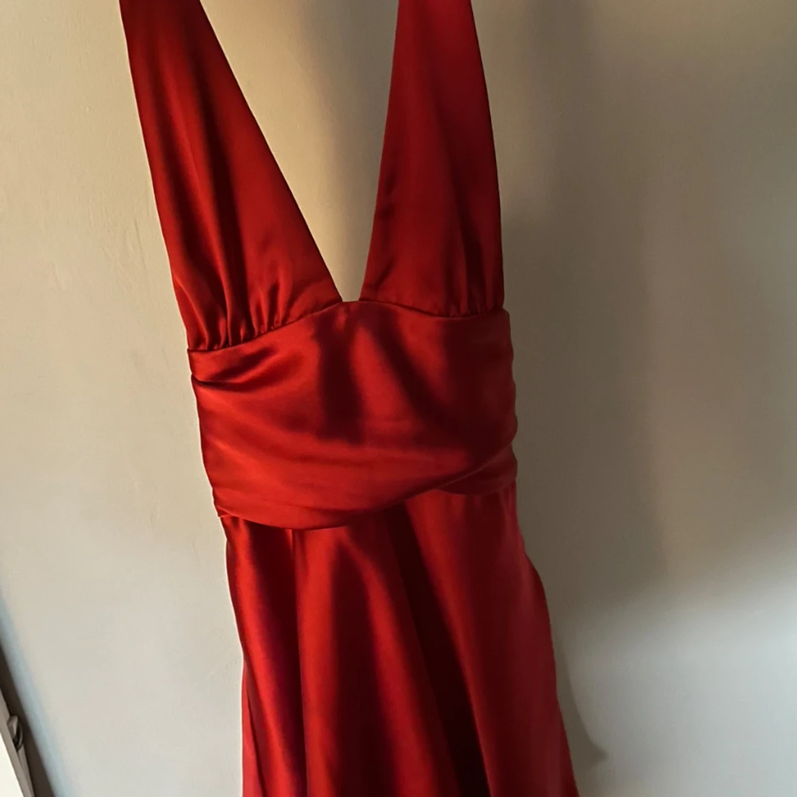 Supersnygg röd kortklänning i satin med djup v-ringning och öppen rygg. Klänningen har breda axelband, knytning i ryggen och en flowy kjol. Perfekt för dig som vill sticka ut med en elegant och trendig look. Aldrig använd (lånade bilder)