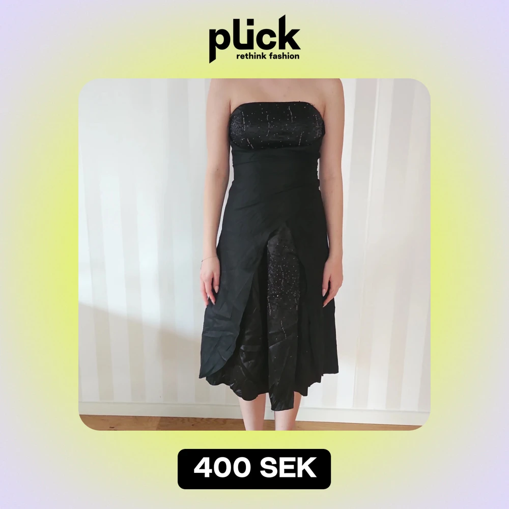 Snygg svart axelbandslös klänning med glittriga detaljer. Perfekt för festliga tillfällen! Den har en elegant snörning i ryggen och en fin passform som framhäver figuren. Klänningen är knälång och har en stilren design.