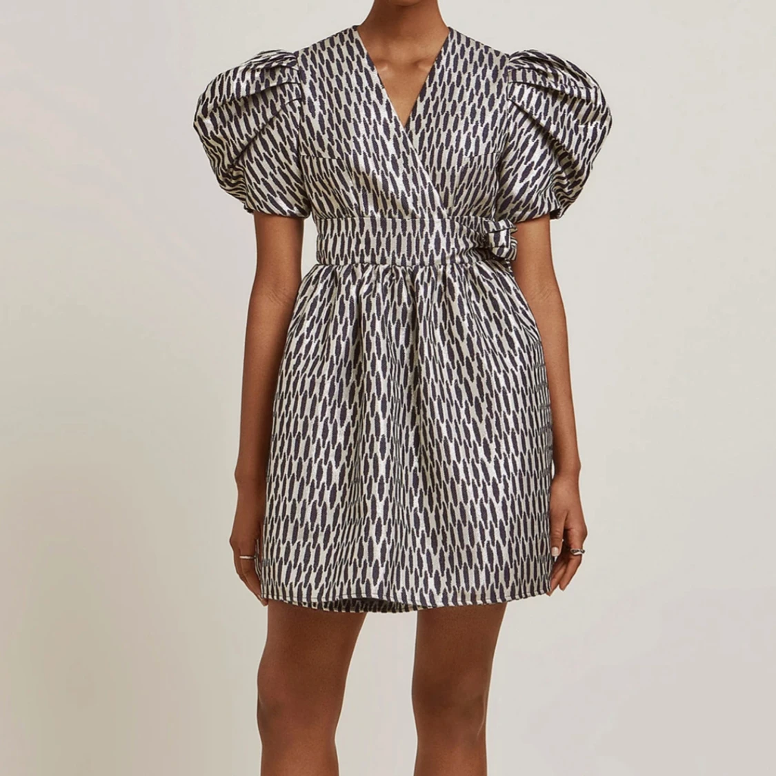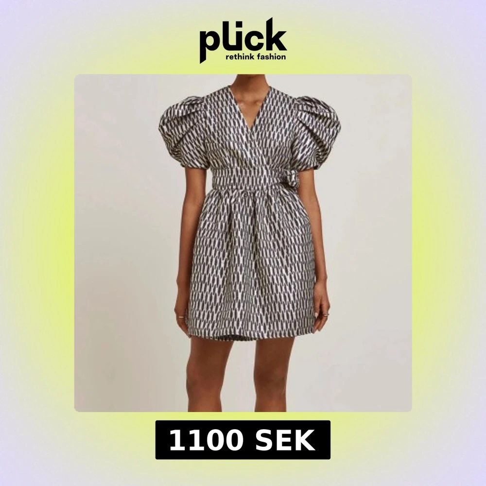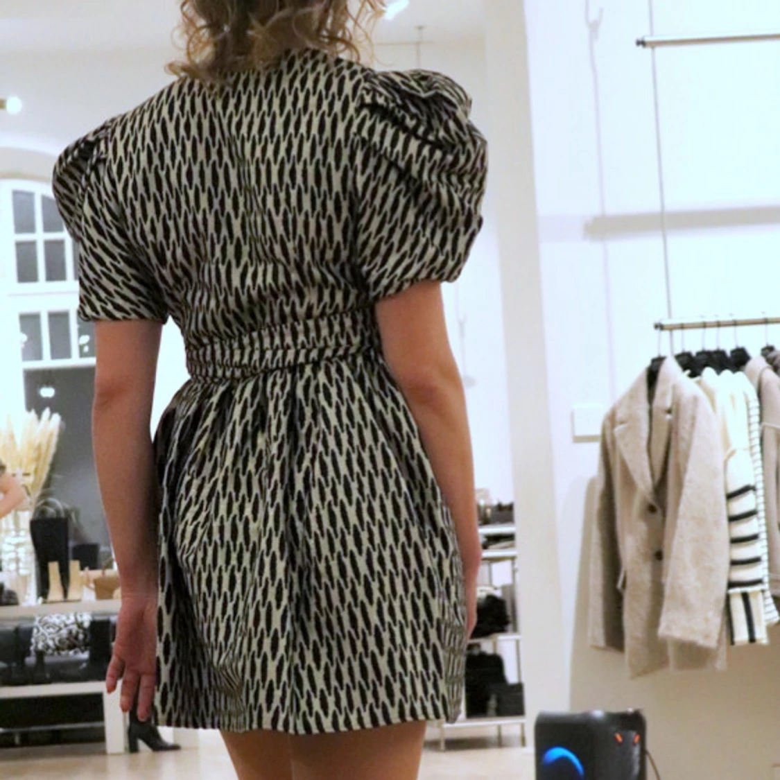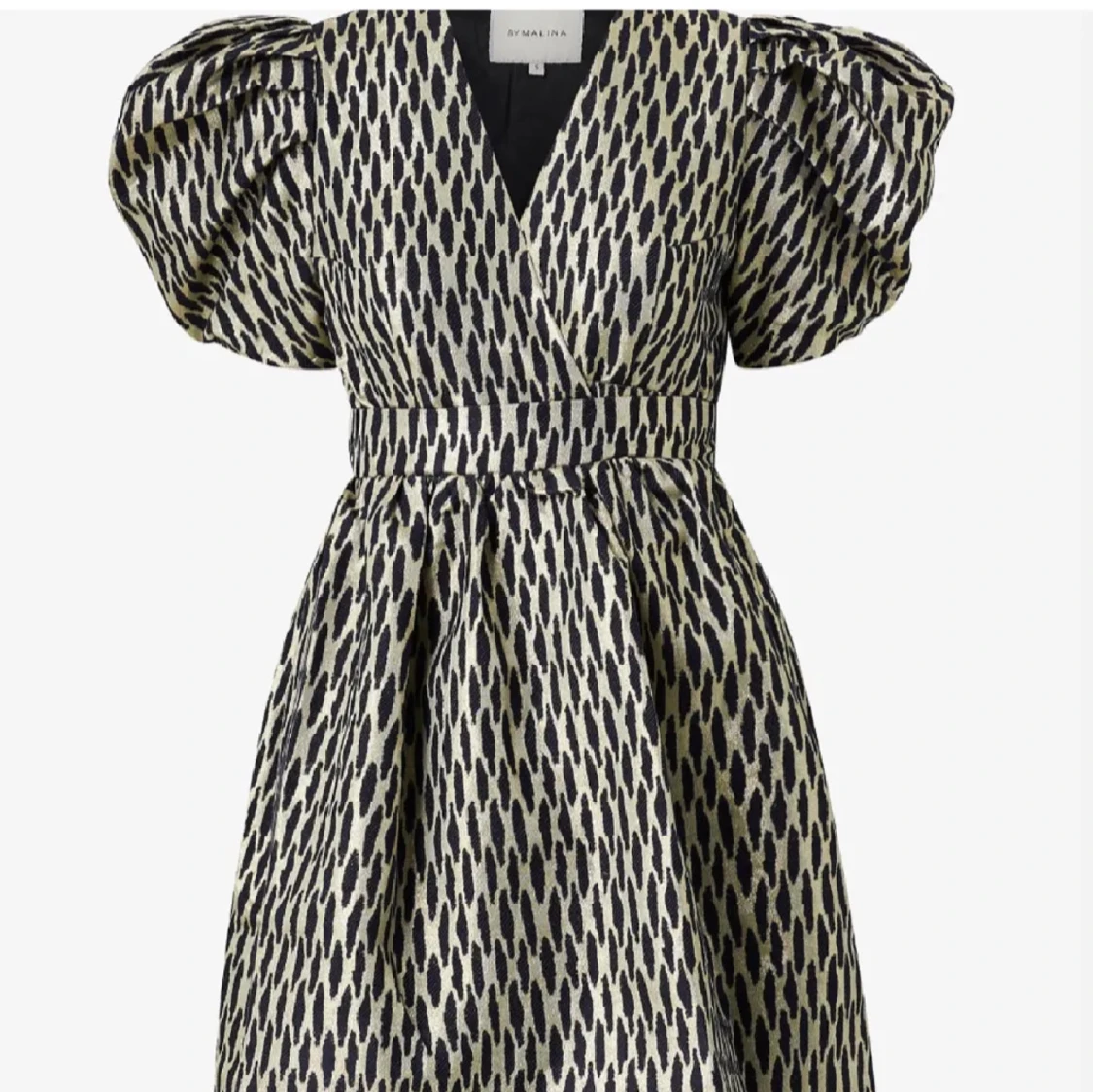 Supersnygg kortklänning från By Malina med svart och beige mönster, puffiga korta ärmar och omlott-v-ringning. Materialet är glansigt och känns lyxigt, perfekt för att sticka ut. Liten i storlek skulle säga passa mer M.