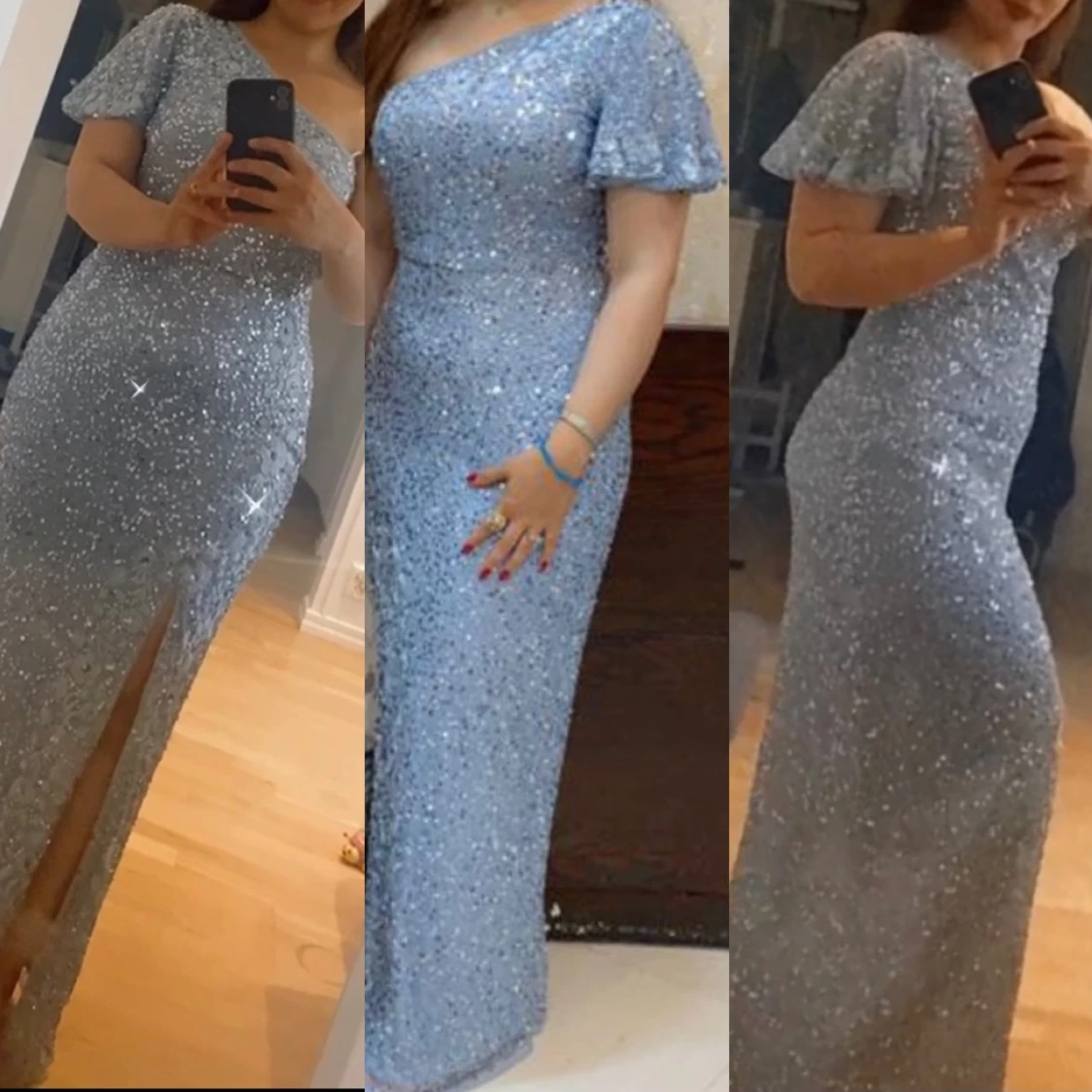 Jattefin Ljusblå glittrig lång festklänning som är nästan oanvänt. Nykoster 1600, säljas pga att den inte kommer till användning.