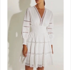 Klänning Inez Dress från By Malina med strukturprickar och virkad spets. Djup v-ringning fram, smock i midjan och kort, utställd kjol. Ärm med smockresår i ärmslut och hålspets. Nyskick!! Skriv för fler bilder:)