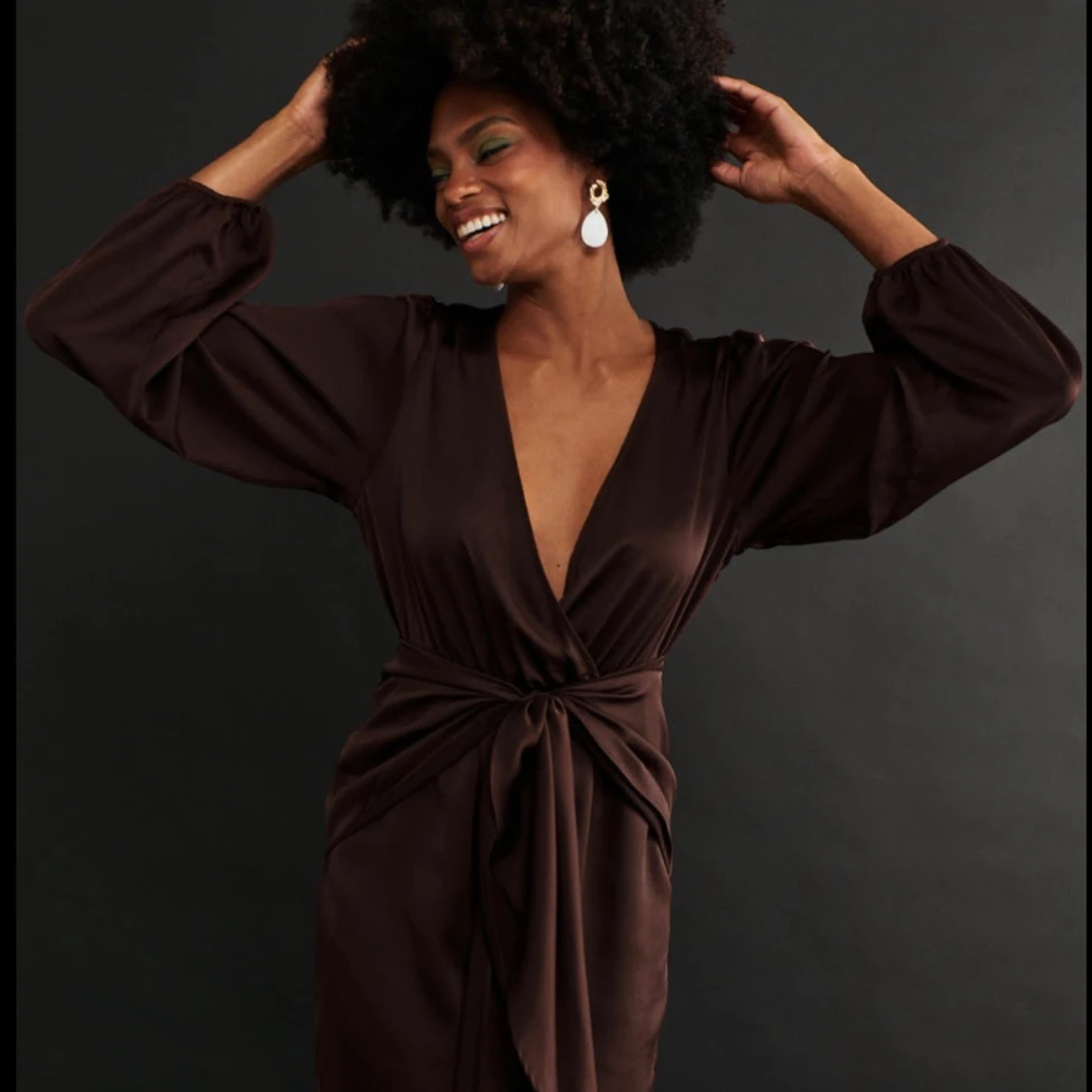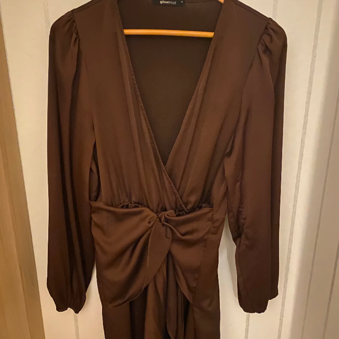 Super snygg brunsatinklänning med ballong arm och knyt detalj vid midjan. Väldigt bra skick andvänd 1 gång.