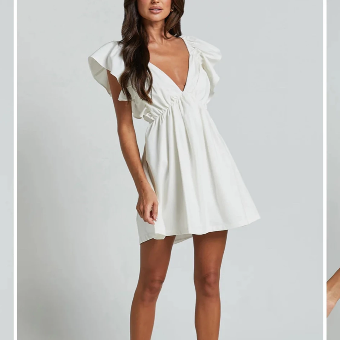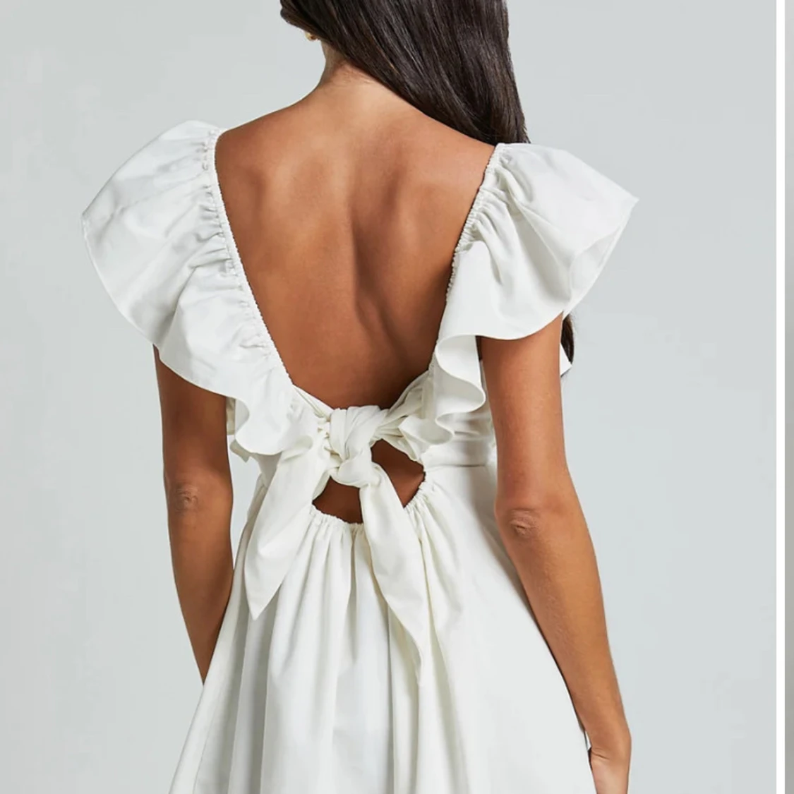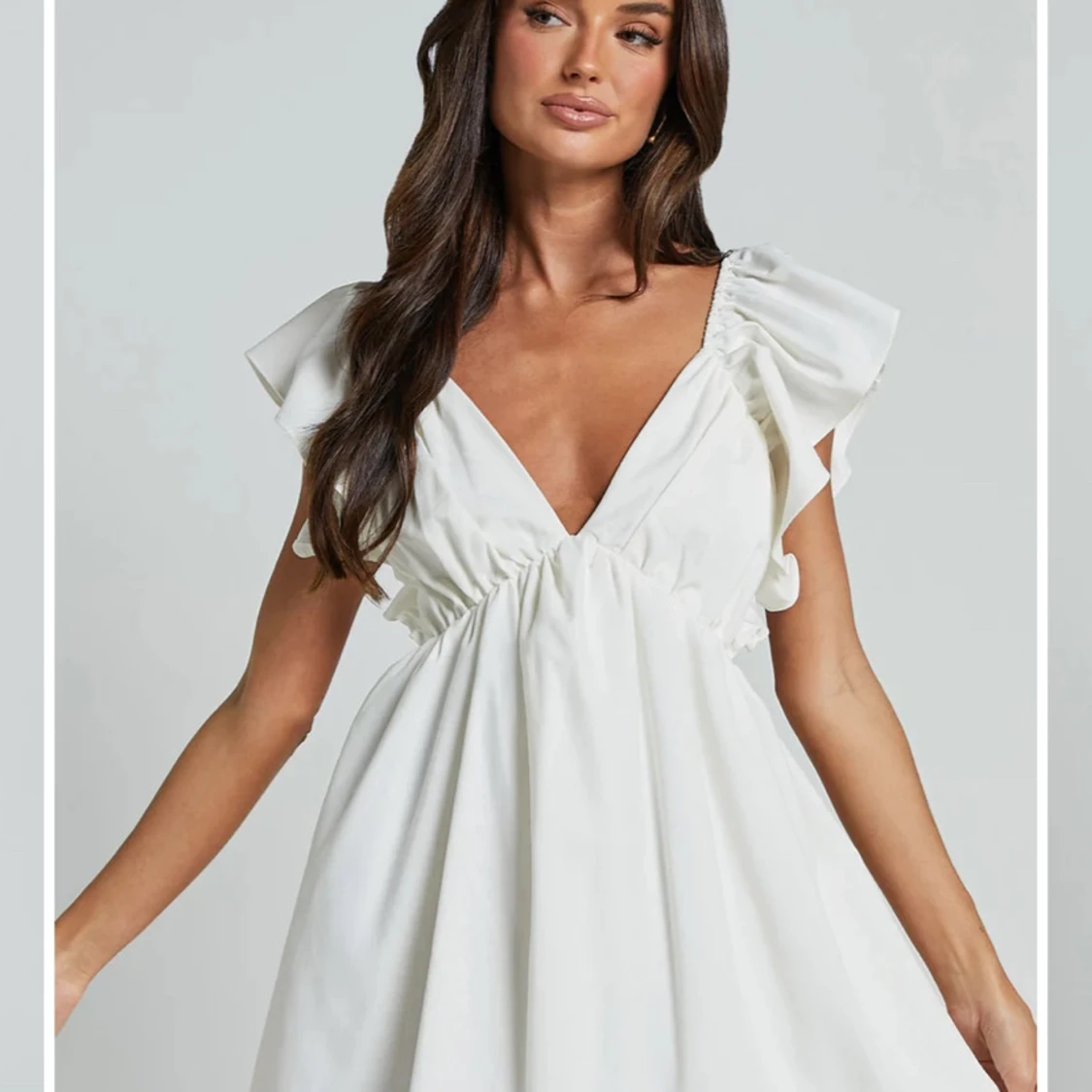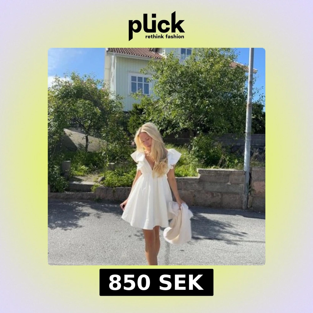Supersöt vit kortklänning med djup v-ringning, volangärmar och öppen rygg med rosett. Klänningen har en flowy passform och är tillverkad i mjukt bomullstyg. Perfekt för studenten! Köpt här på plick men säljer pågrund av att den ej passade mig. Ej använd bara testad, prislapp finns kvar! Storlek xs, justerbar i ryggen. Från Showpo, slutsåld på hemsidan! Pris kan diskuteras.