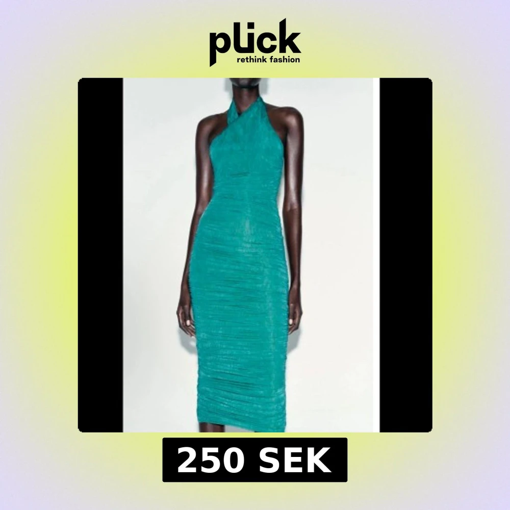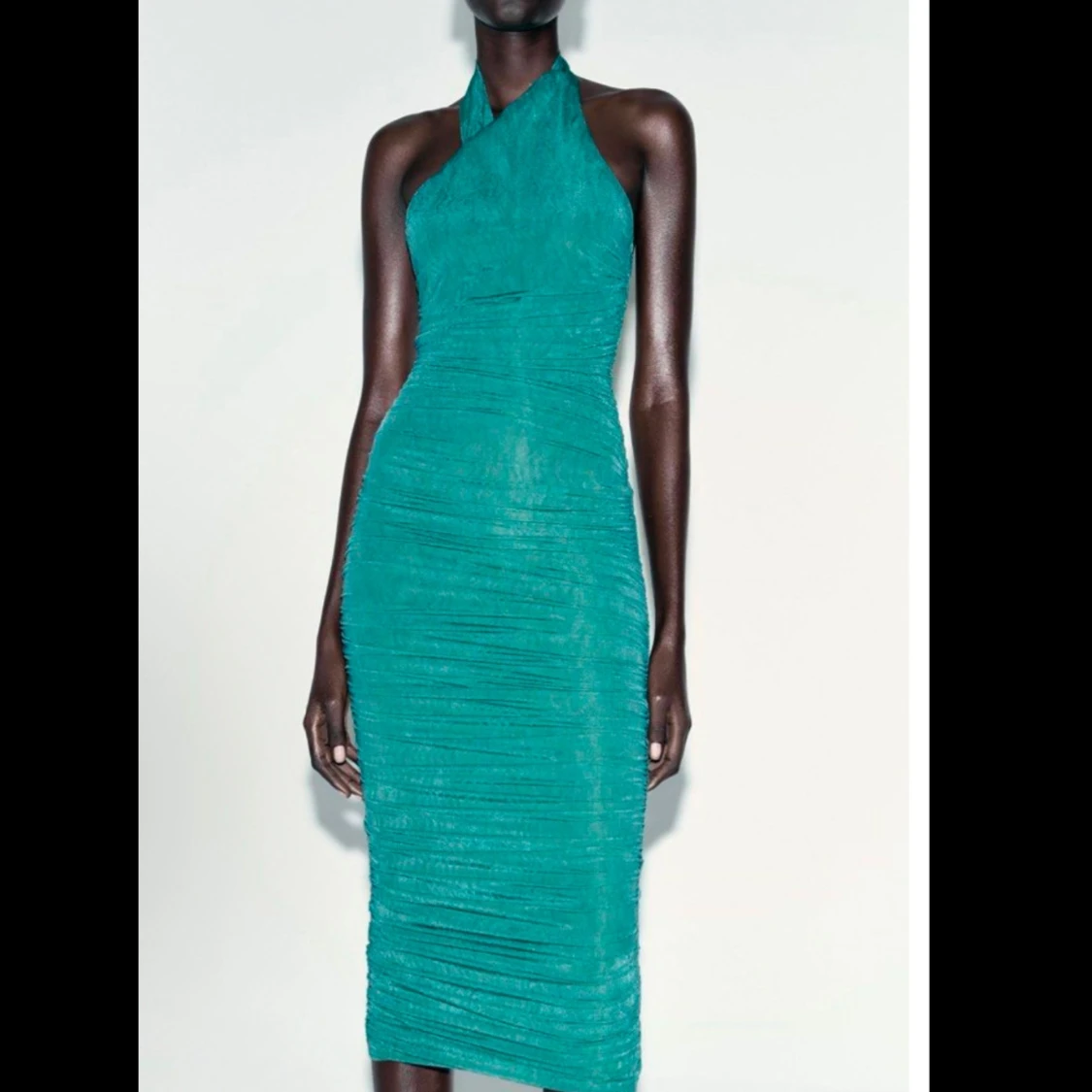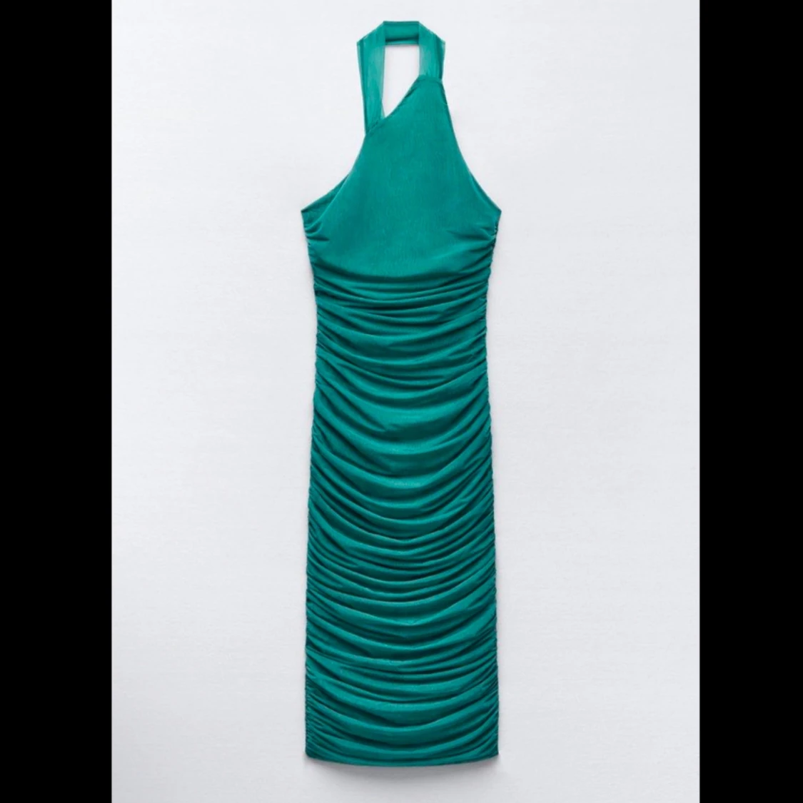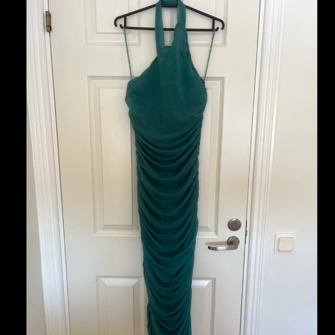 Snygg grön halterneck klänning med rynkade detaljer och en tight passform. Klänningen har en elegant längd och en öppen rygg som ger en stilren look. Perfekt för speciella tillfällen.