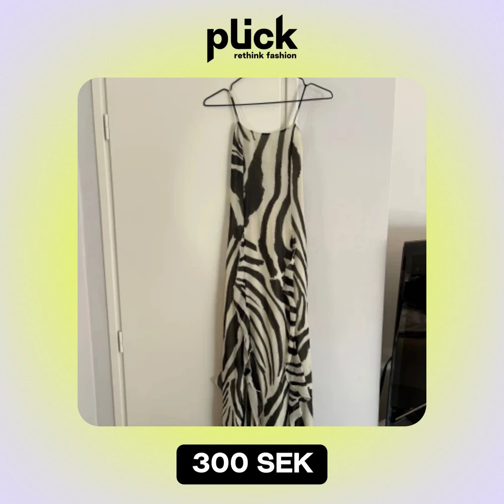 Otrolig långklänning med slitsdetalj i zebramönster från H&M, aldrig använd, lappen kvar 🥰 djup rygg med knytdetalj. Storlek XS, normal i storleken! Nypris 599kr Sista bilden är en liknande klänning!
