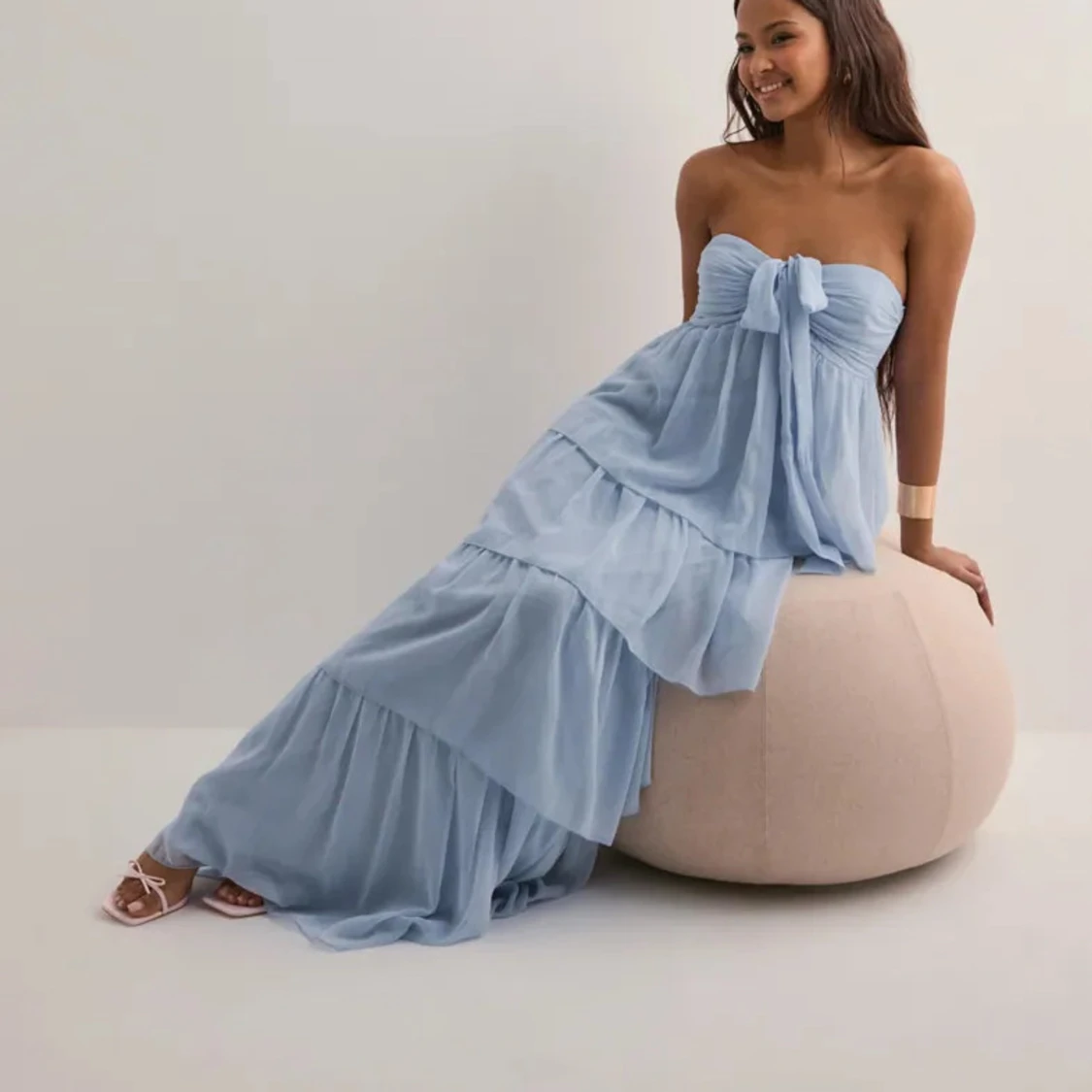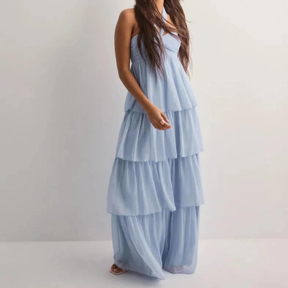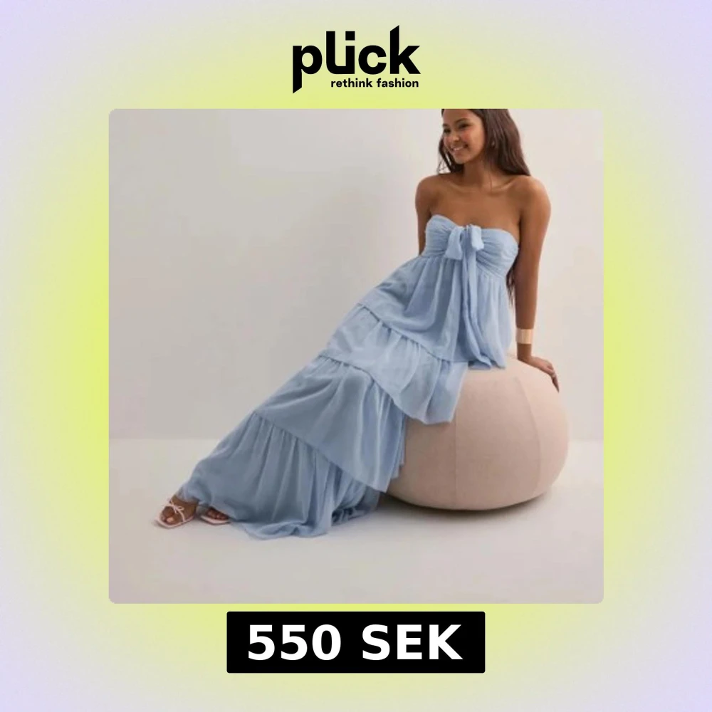 Superfin långklänning i ljusblått från Nelly. Klänningen har flera lager volanger, är axelbandslös och har en söt rosettdetalj framtill. Luftigt material som känns perfekt för varma dagar. Passar dig som gillar romantisk och flowy stil.